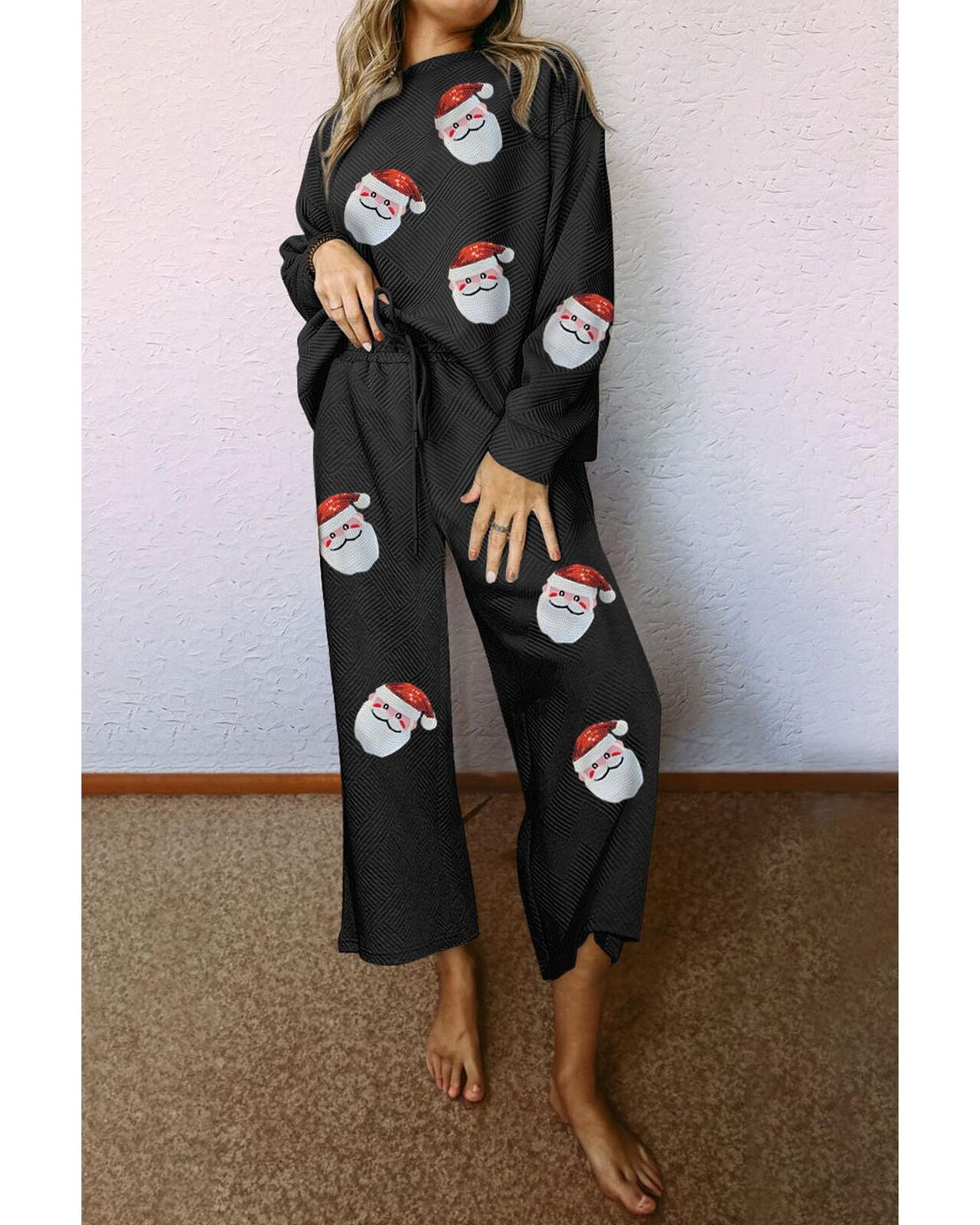 • Black Christmas Sequined Santa Clause Print Textured Pants Set