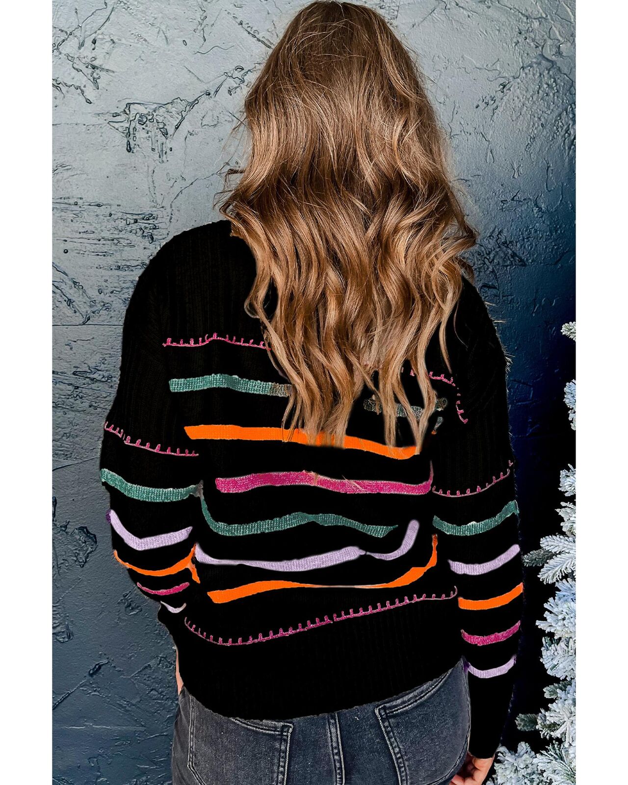 • Black Colorful Striped Ribbed Trim Sweater
