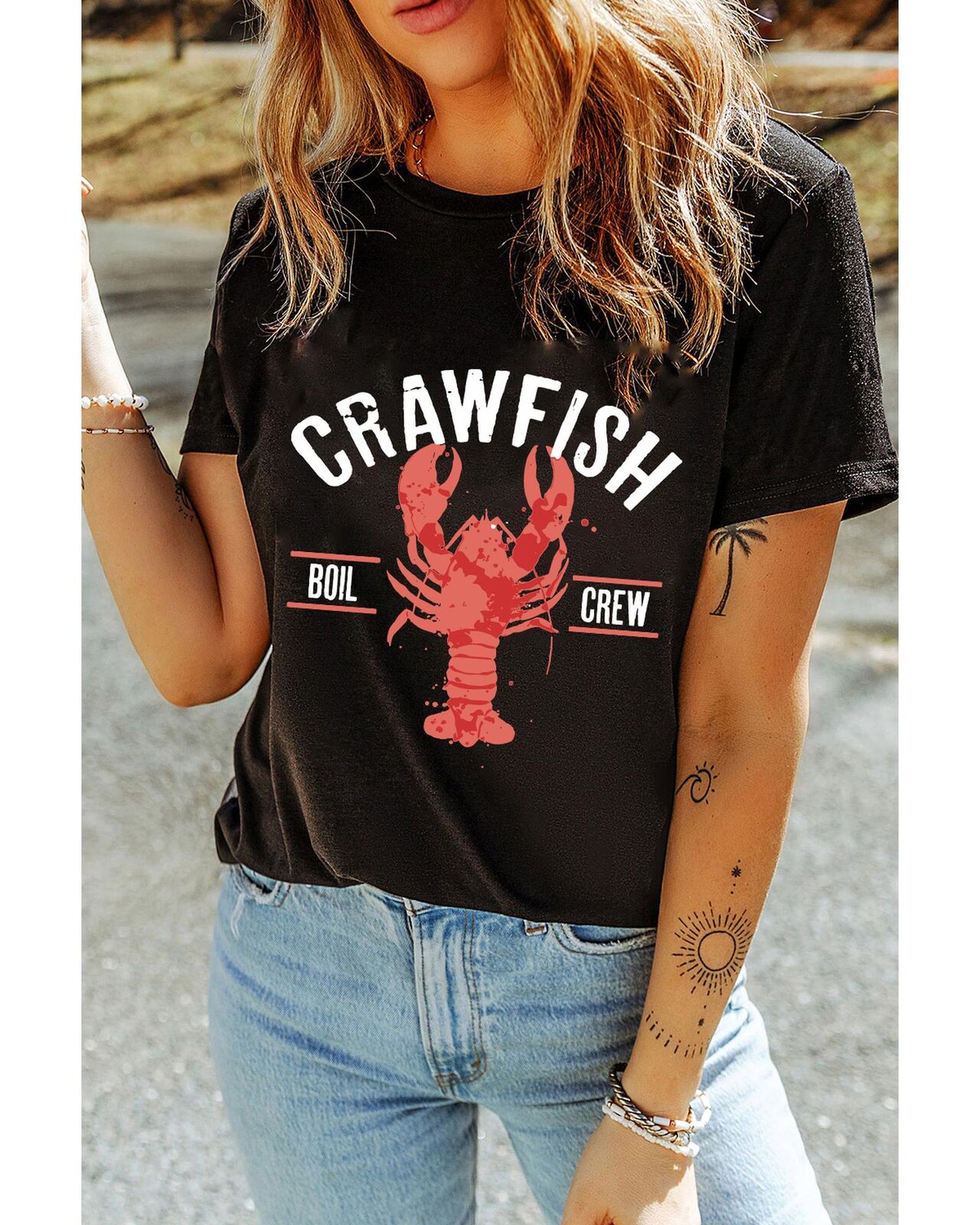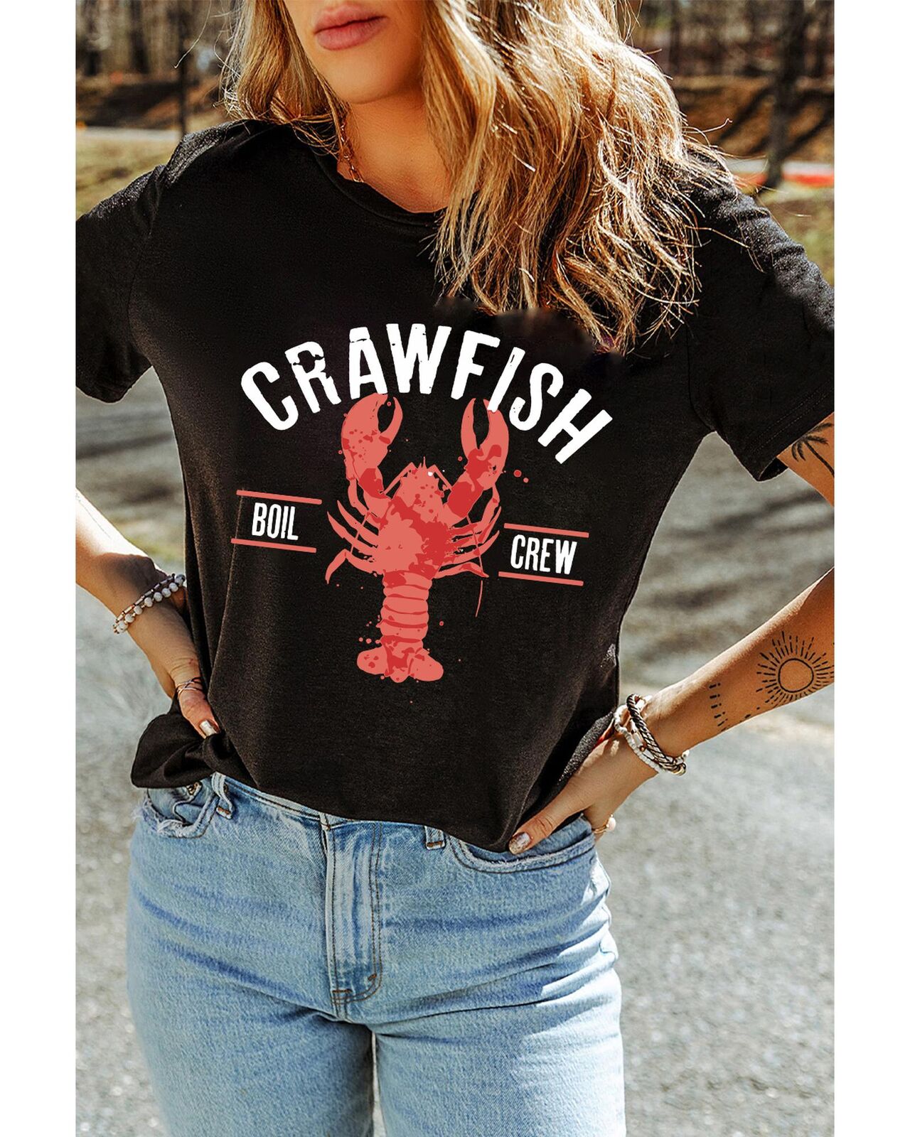 • Black CRAWFISH BOIL CREW Distressed Letter Graphic T Shirt