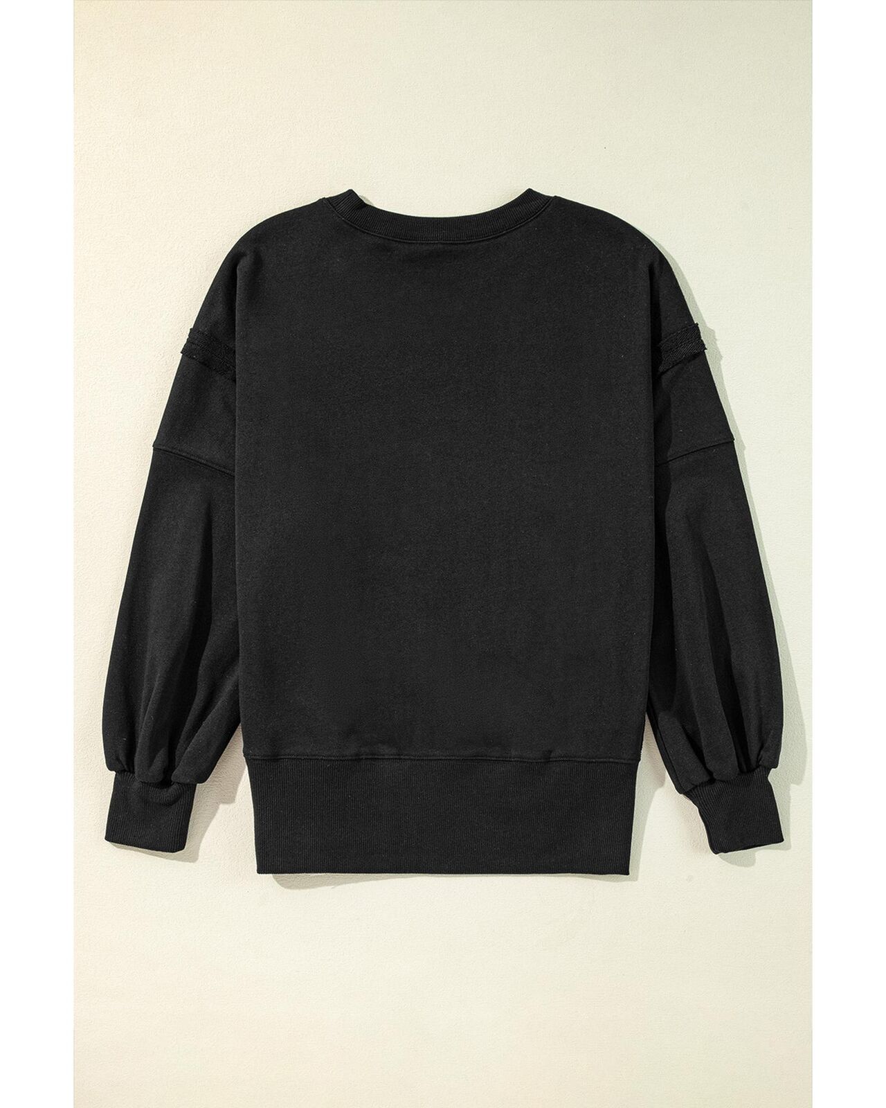 • Black Exposed Seam Drop Shoulder Round Neck Sweatshirt with Slits