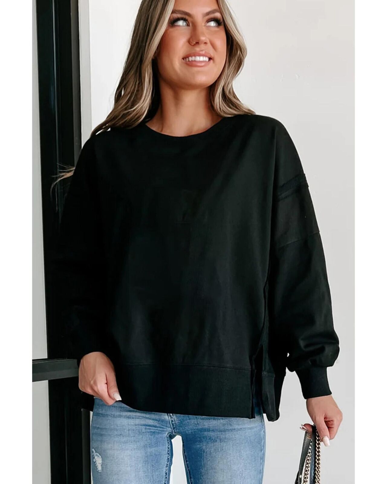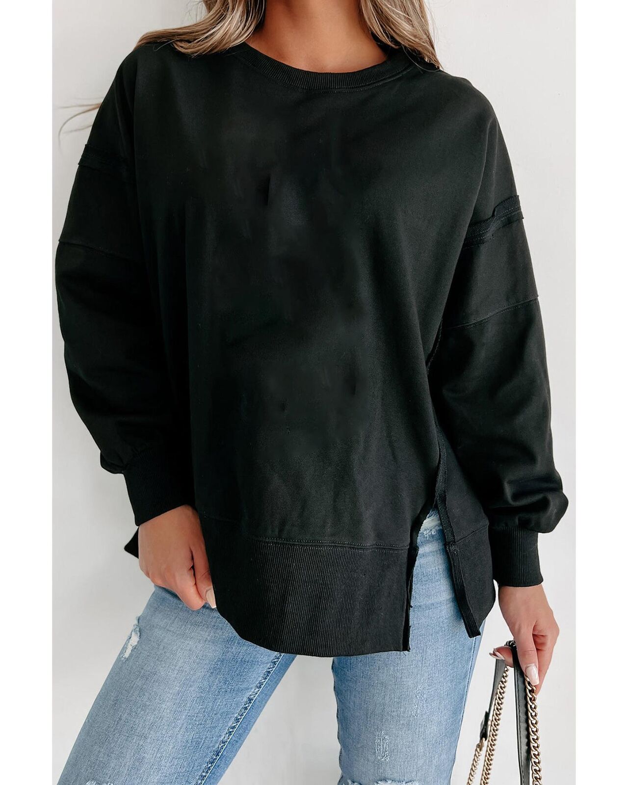 • Black Exposed Seam Drop Shoulder Round Neck Sweatshirt with Slits