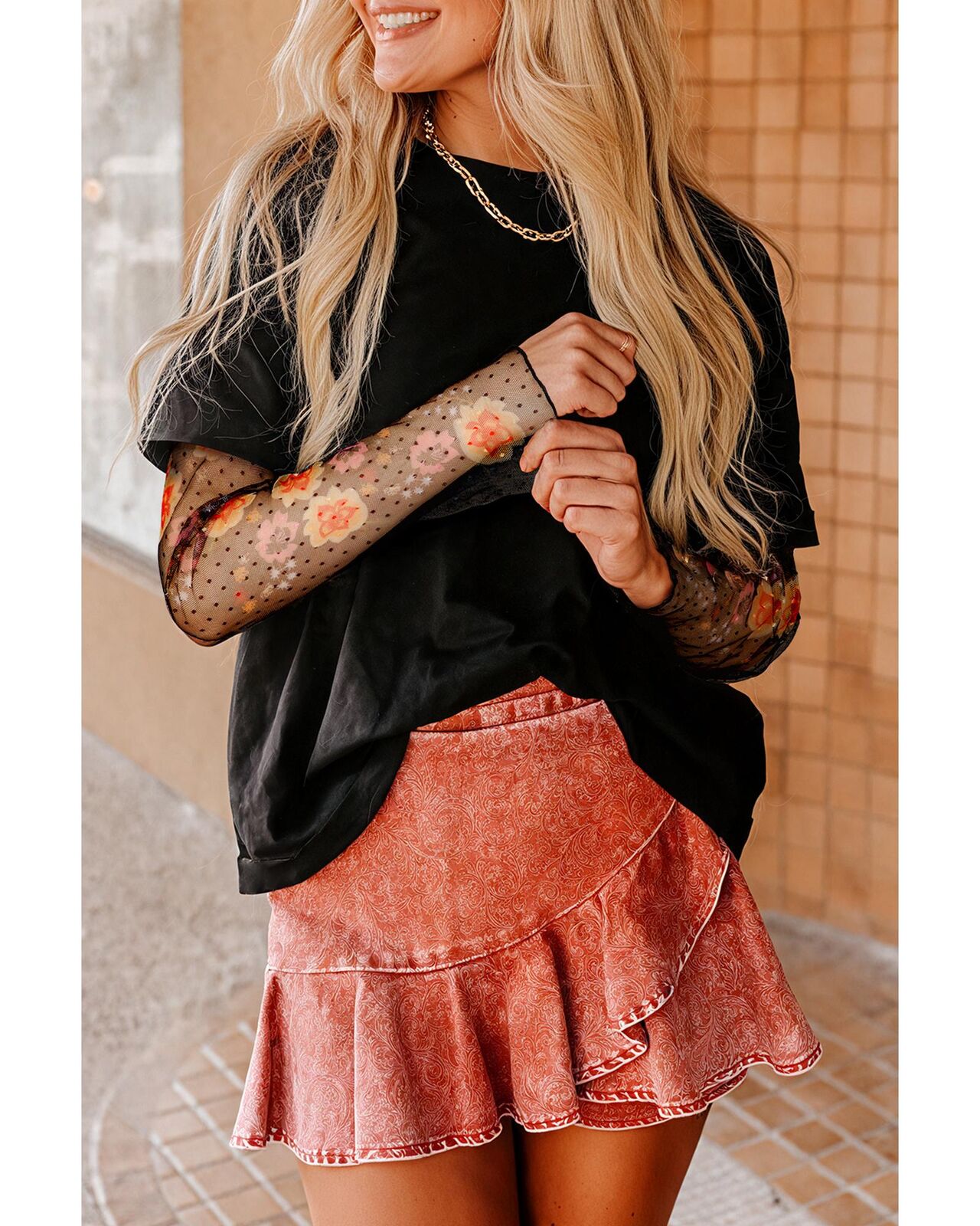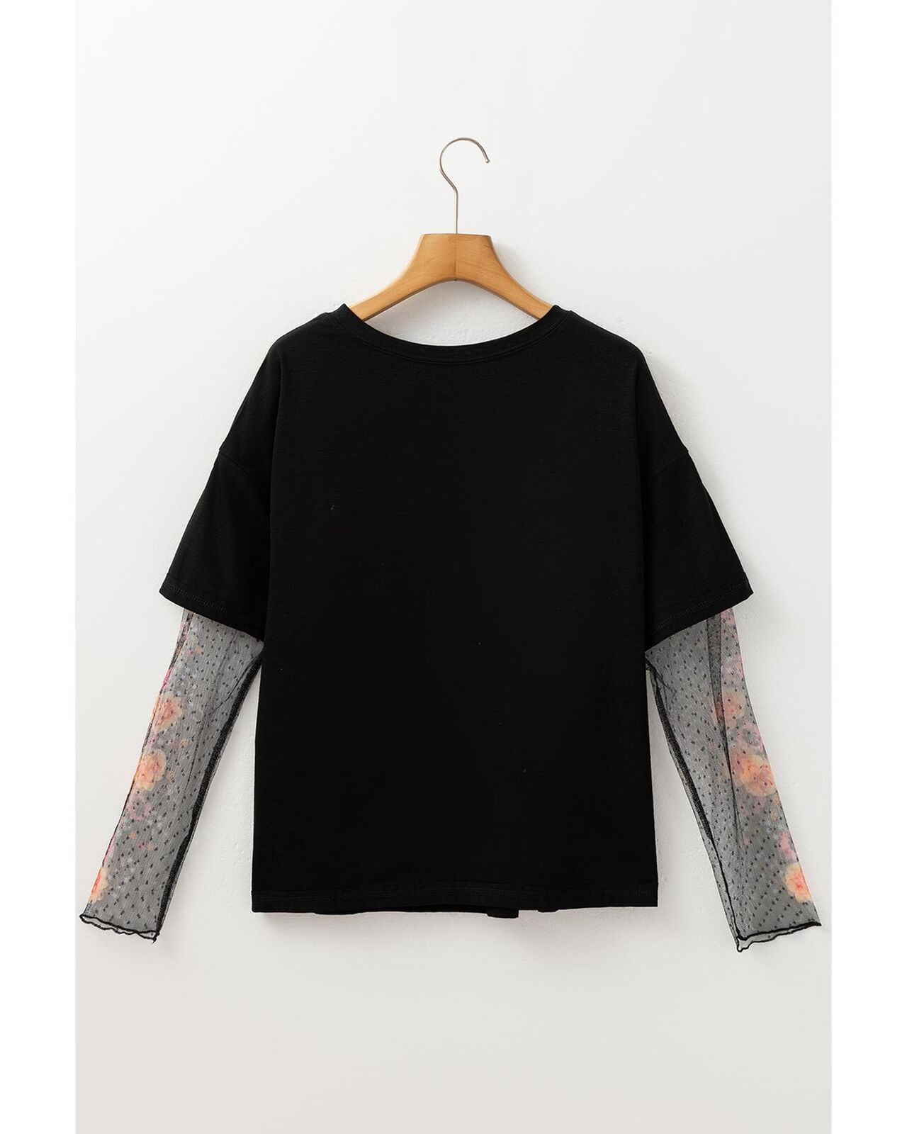 • Black Faux Two Piece Floral Long Sleeve Patchwork Tee