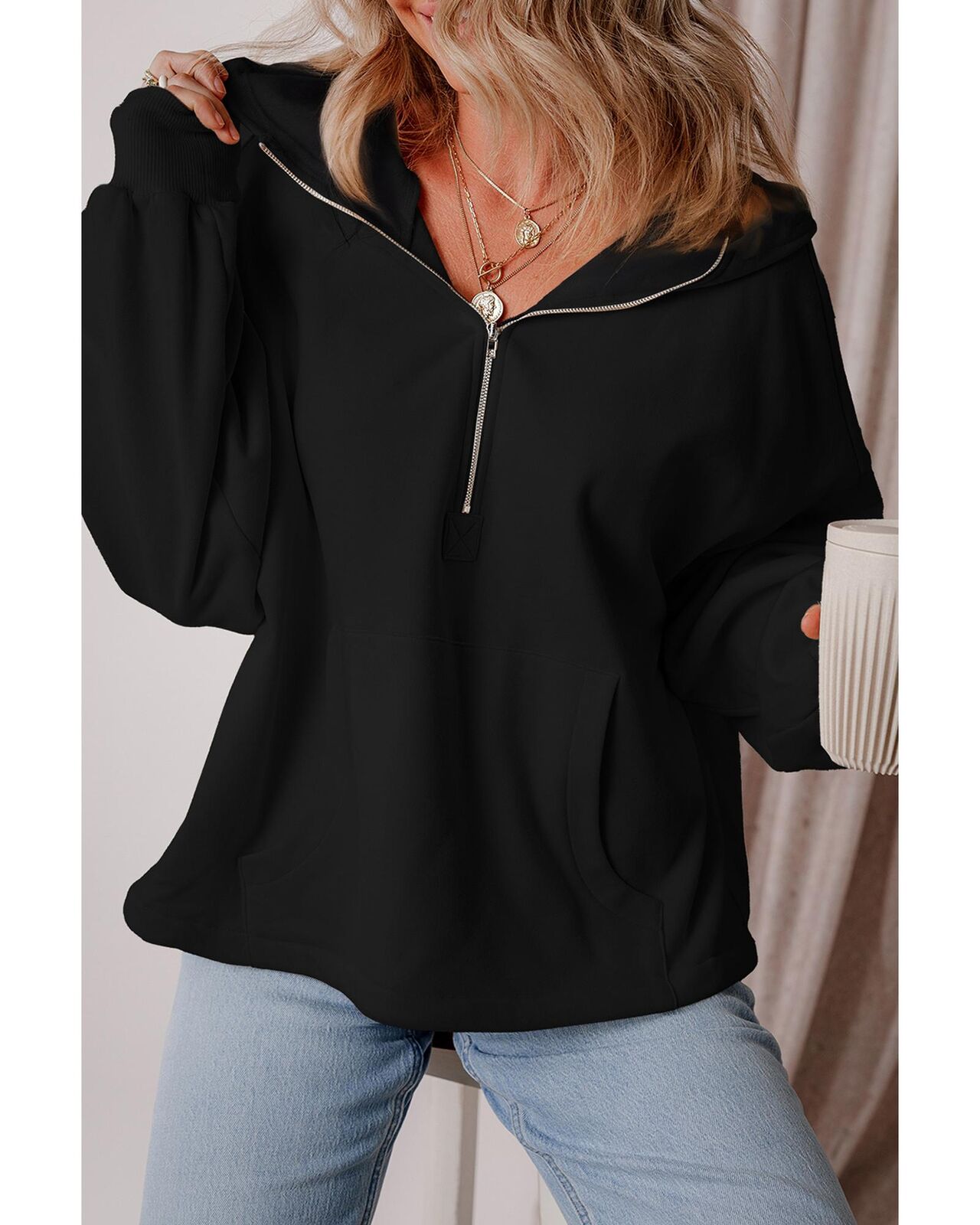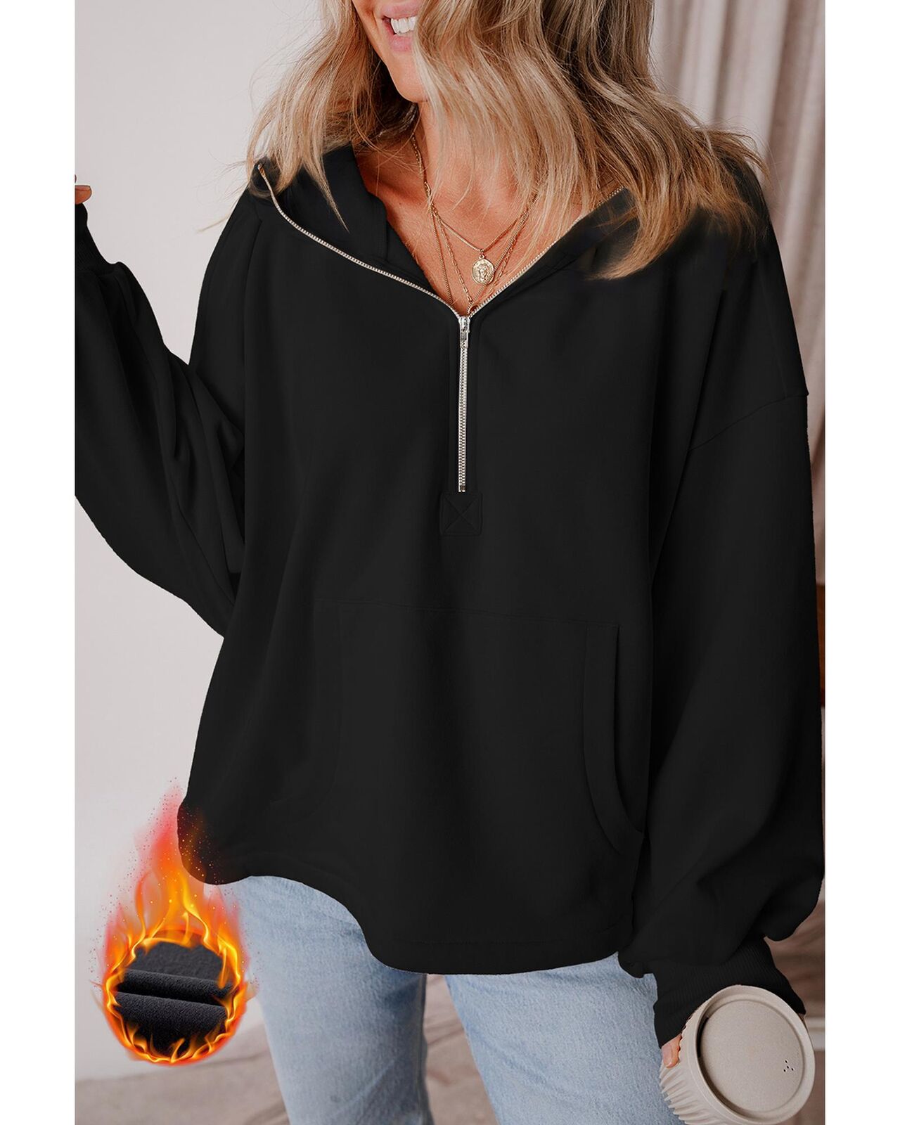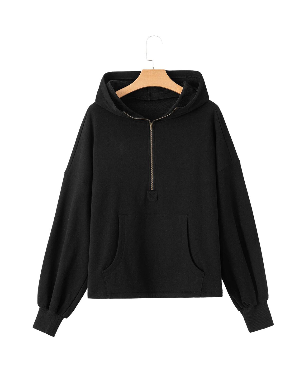 • Black Fleece Lined Half Zipper Kangaroo Pockets Loose Hoodie