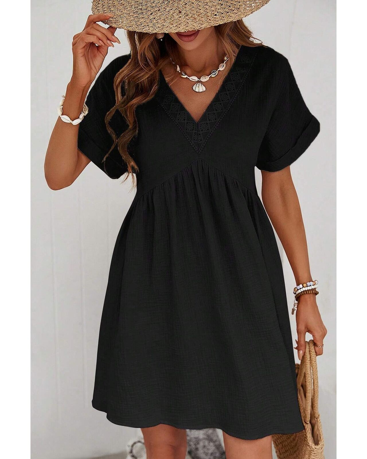 • Black Folded Short Sleeve Lace V Neck Mini Dress