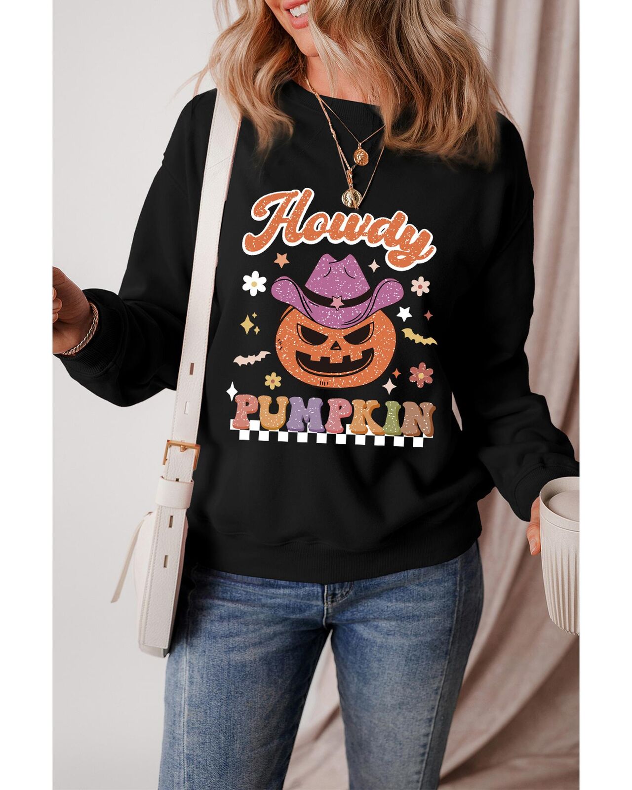 • Black Halloween Howdy PUMPKIN Print Crew Neck Pullover Sweatshirt