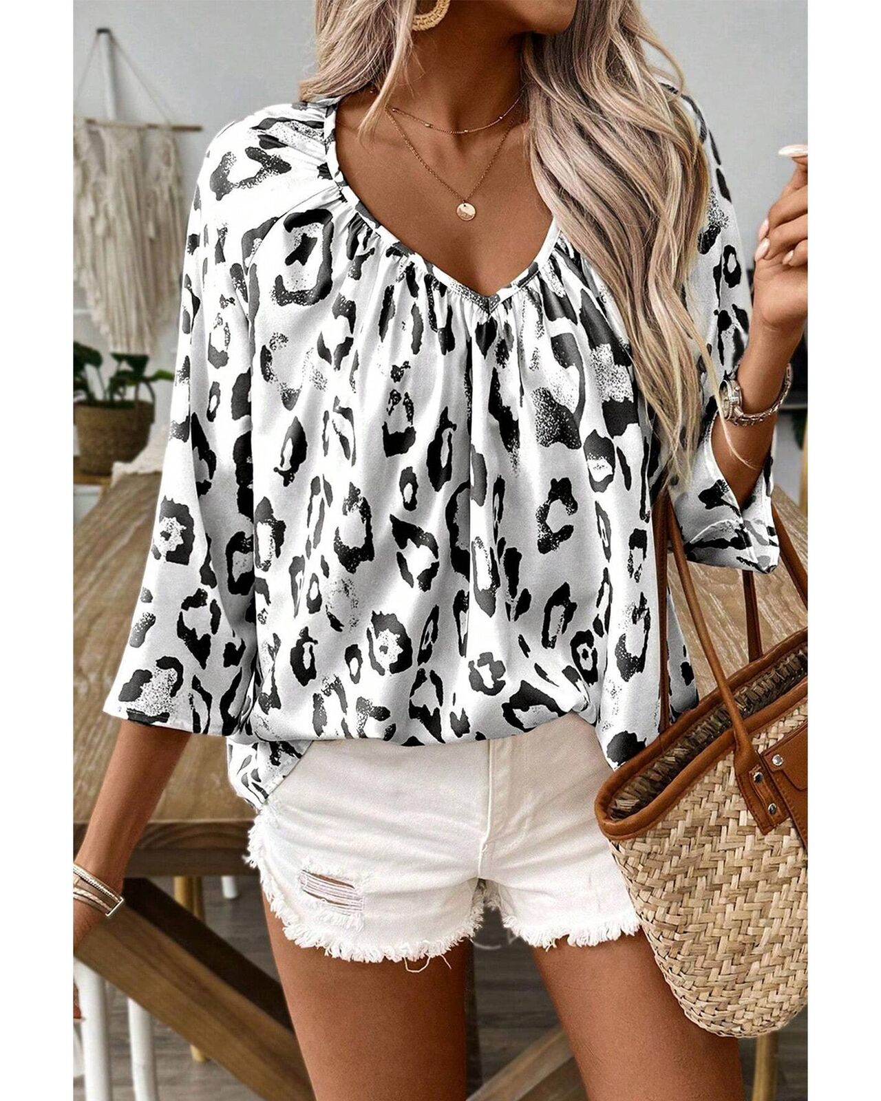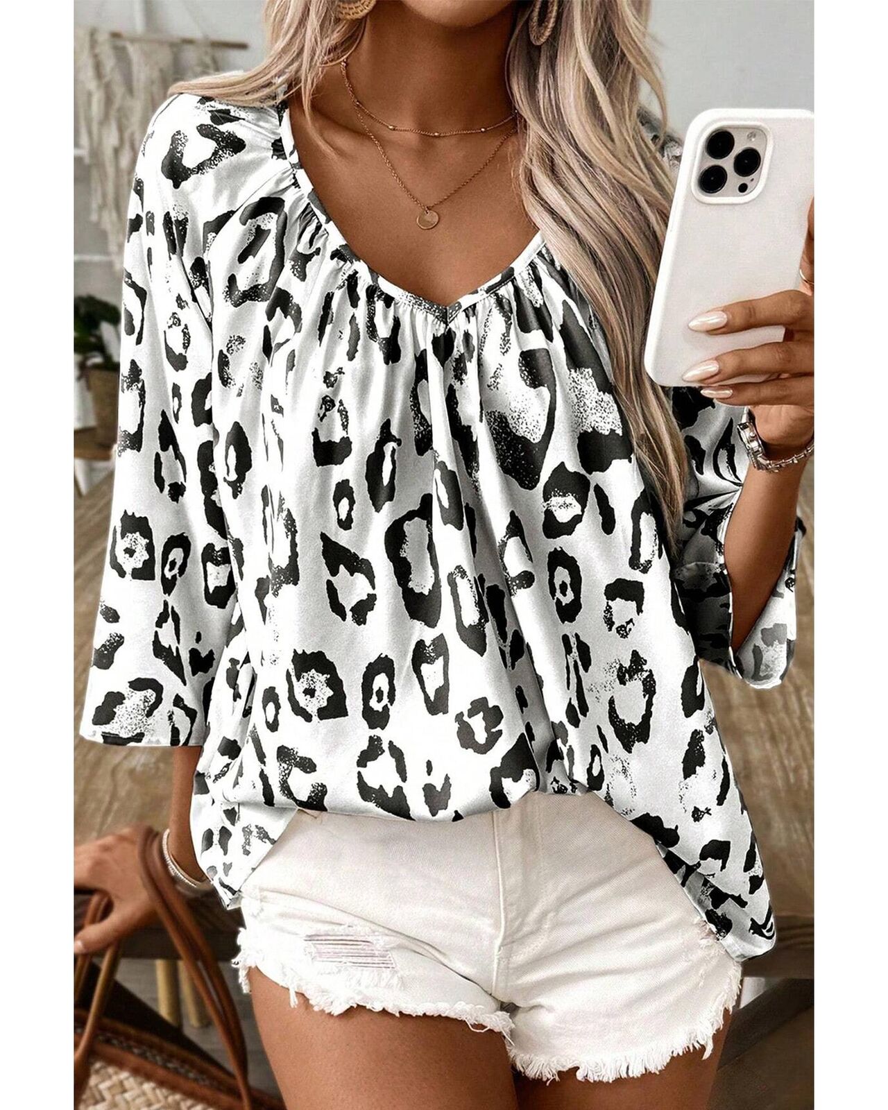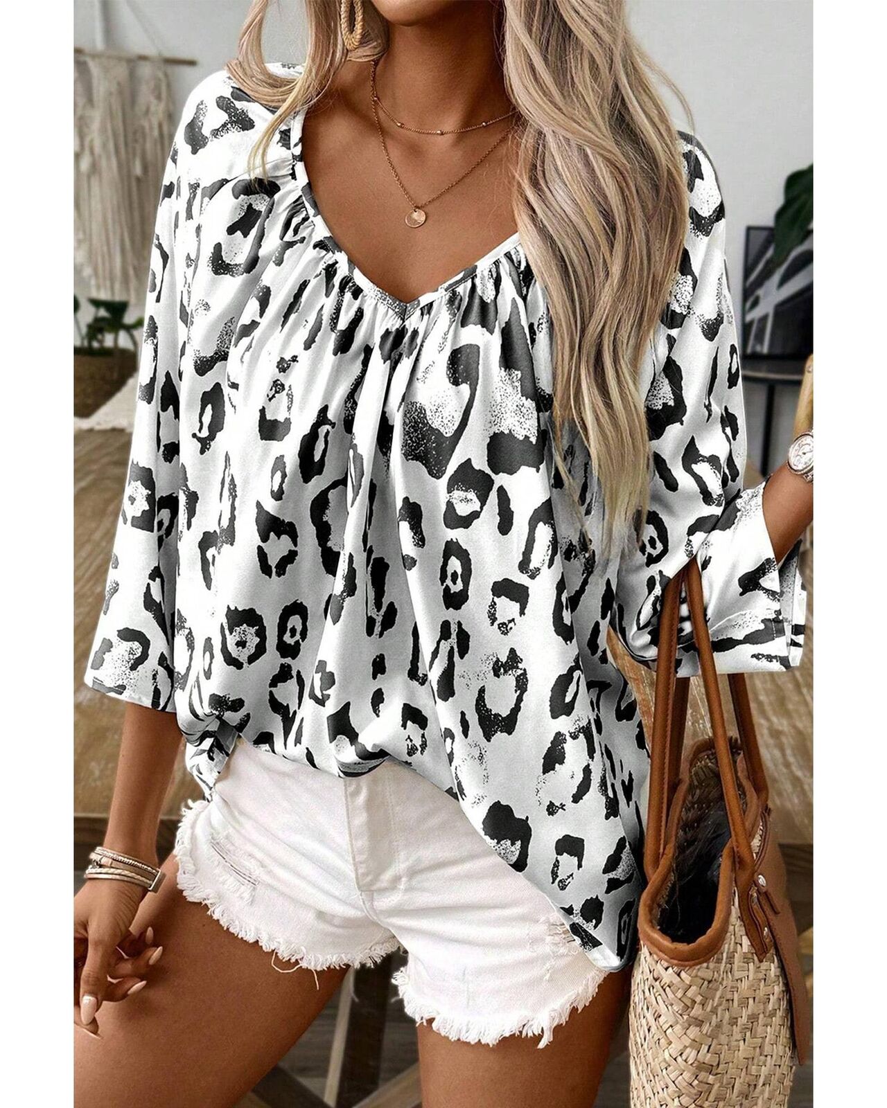 • Black Leopard Print Ruched V Neck 3/4 Sleeve Blouse