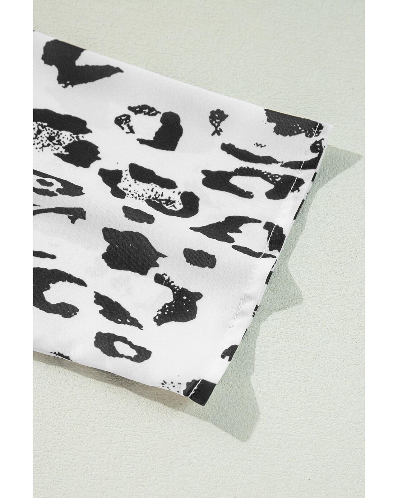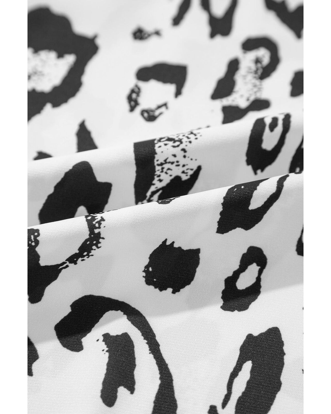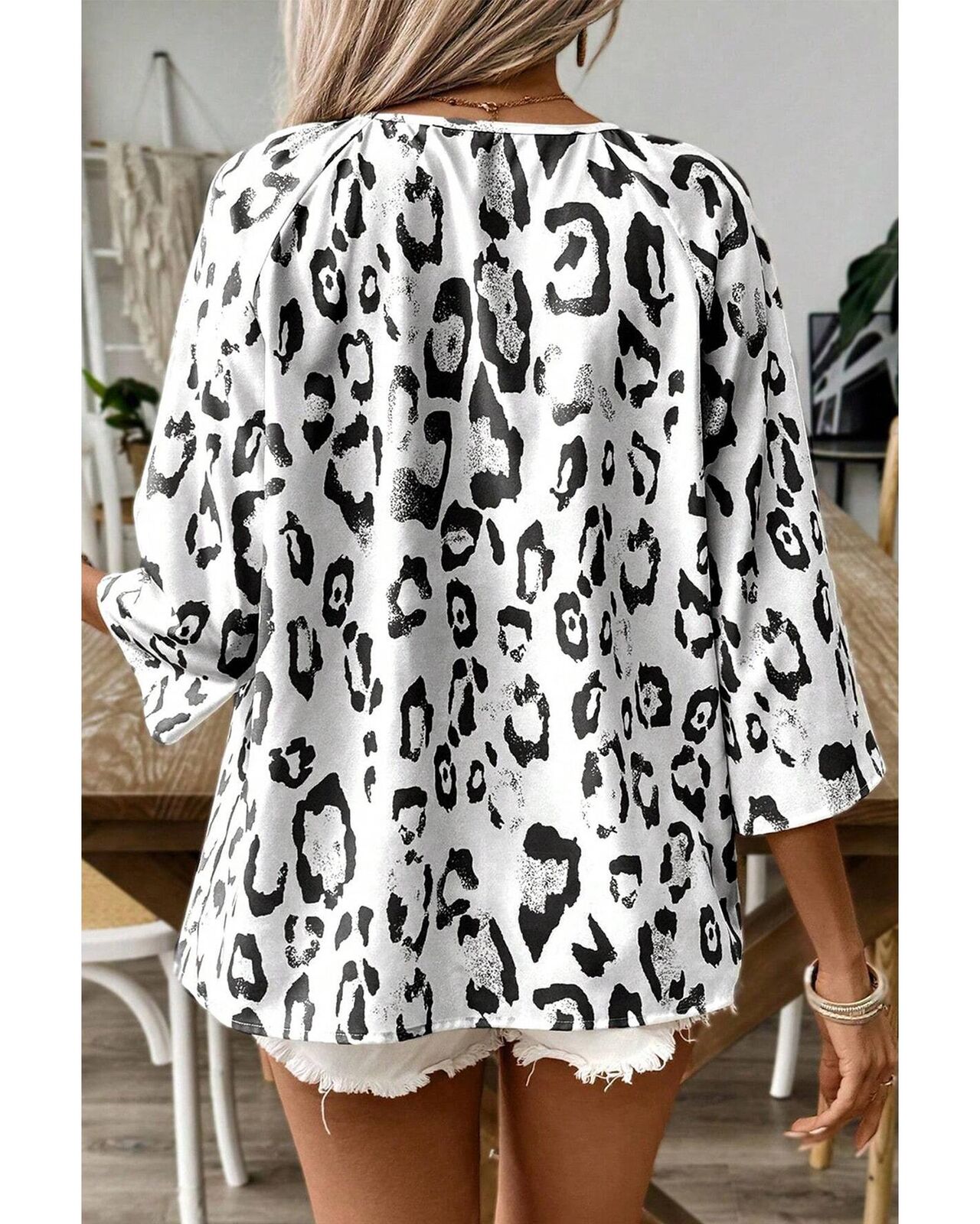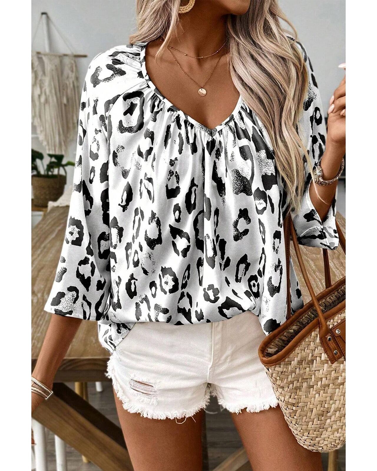 • Black Leopard Print Ruched V Neck 3/4 Sleeve Blouse