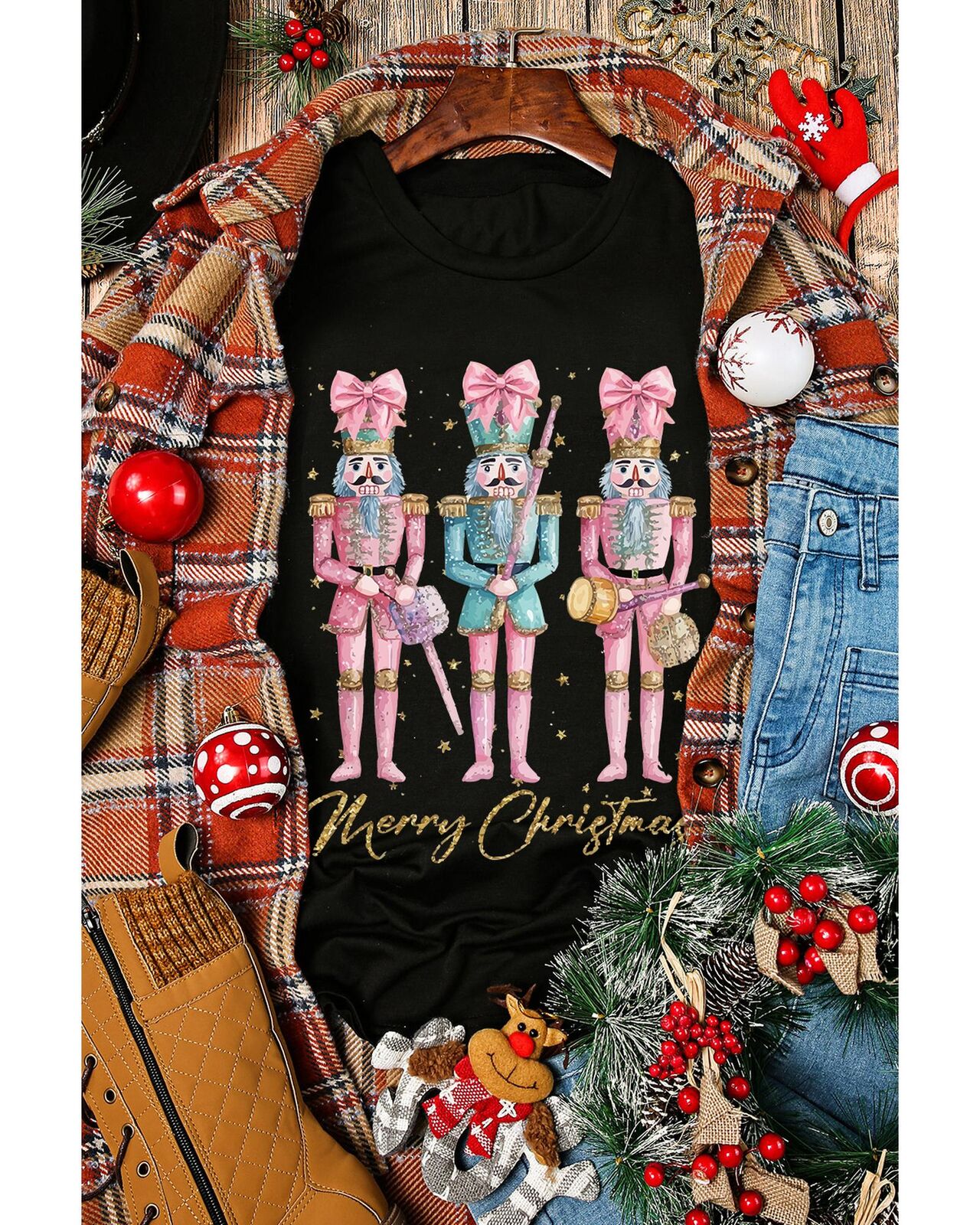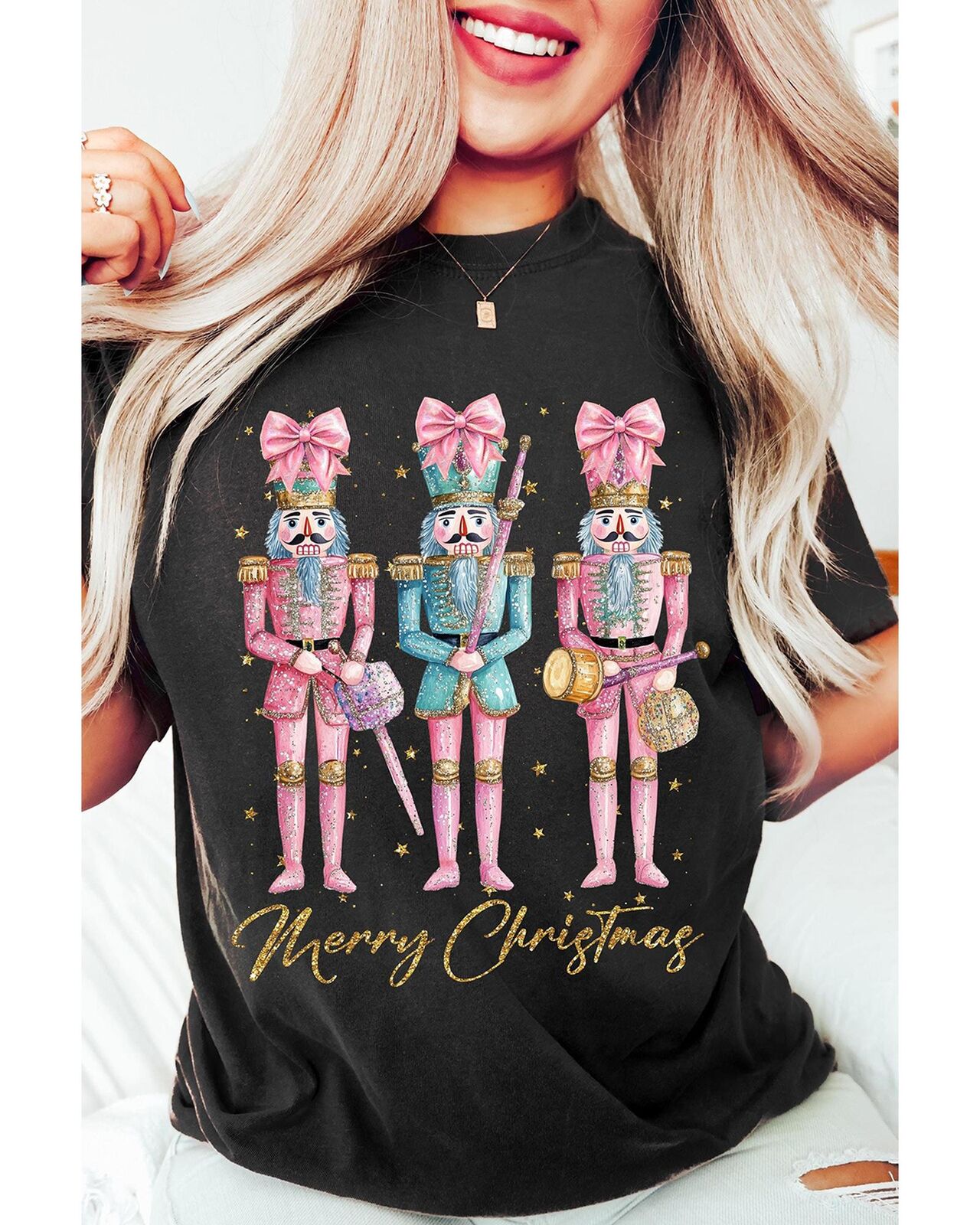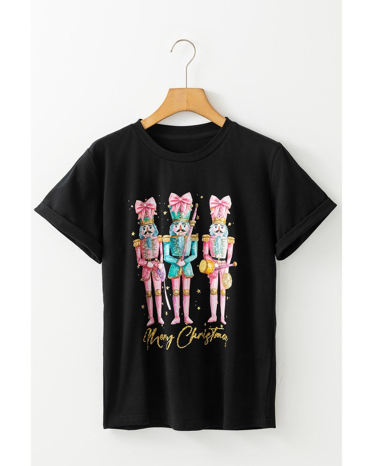 • Black Nutcracker Merry Christmas Printed Crewneck T
