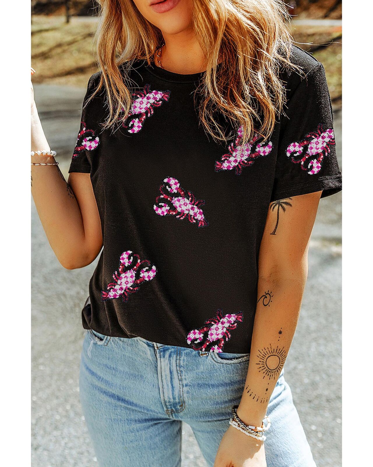 • Black Sequin Crawfish Patched Crew Neck Tee