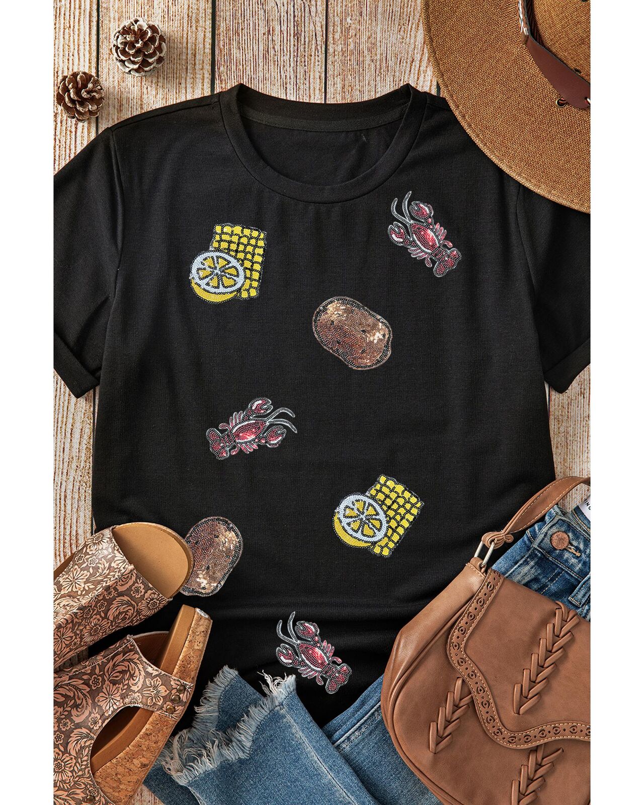 • Playful graphic featuring crawfish corn lemon and potatoes