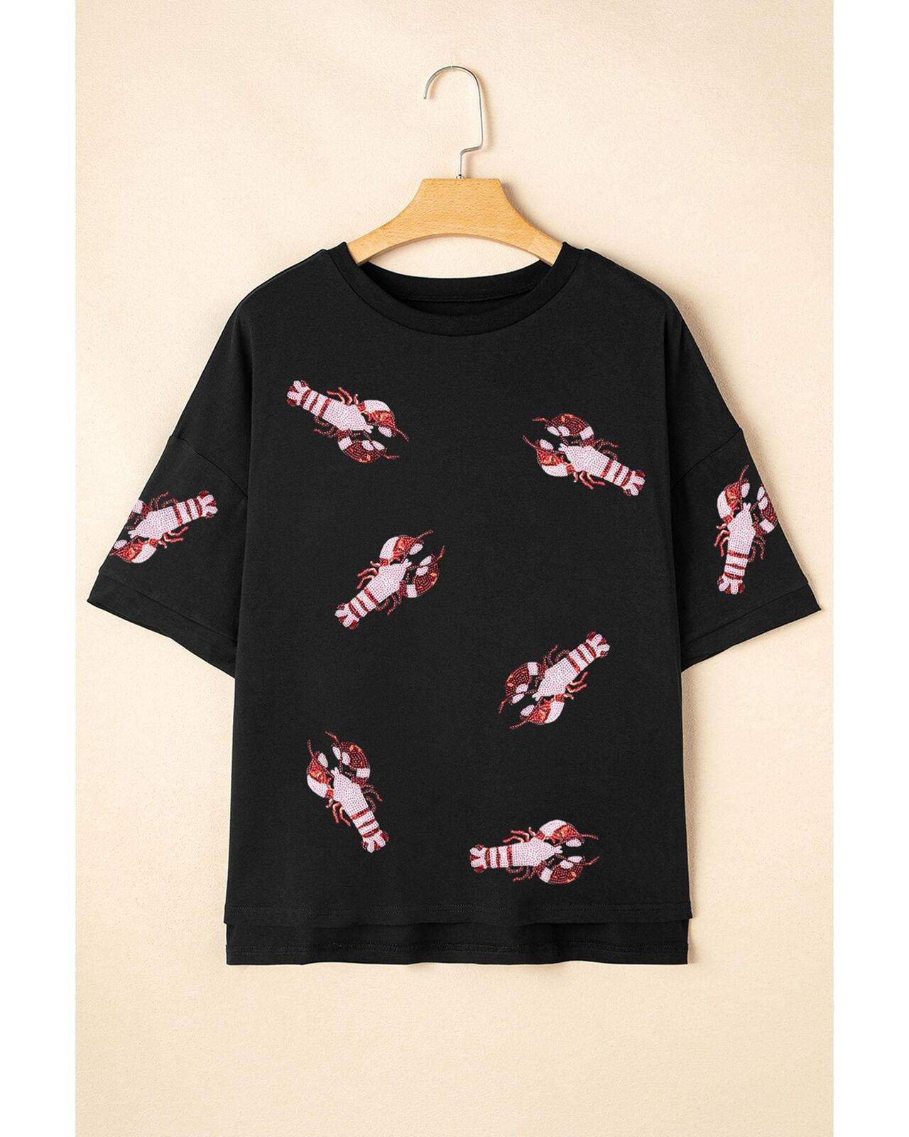 • Playful sequin crayfish graphics with glitter details