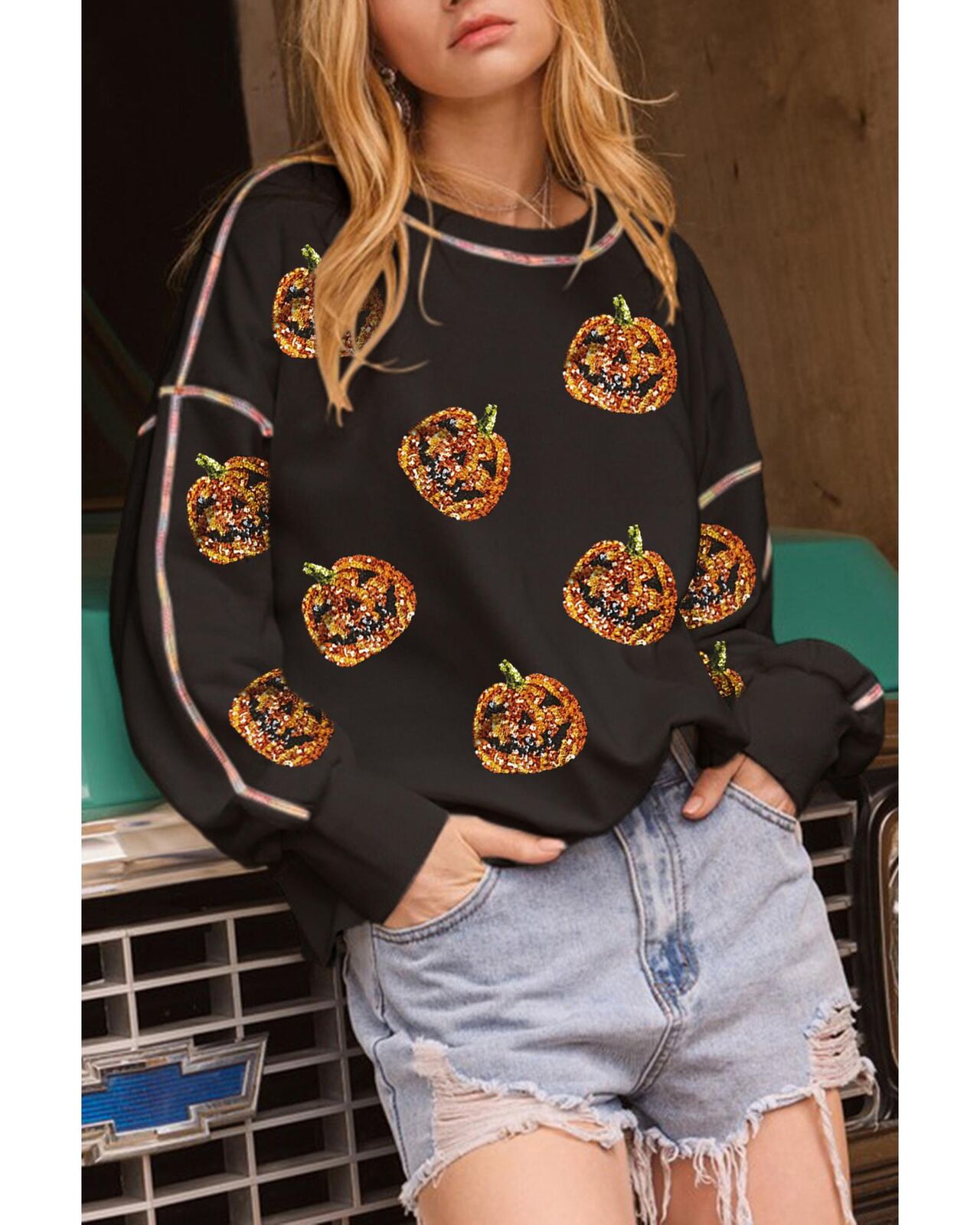 • Black Sequin Pumpkin Face Graphic Exposed Seam Halloween Sweatshirt