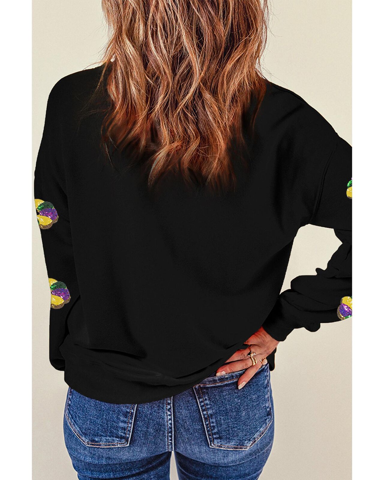 • Black sweatshirt with sequined donuts in Mardi Gras colors