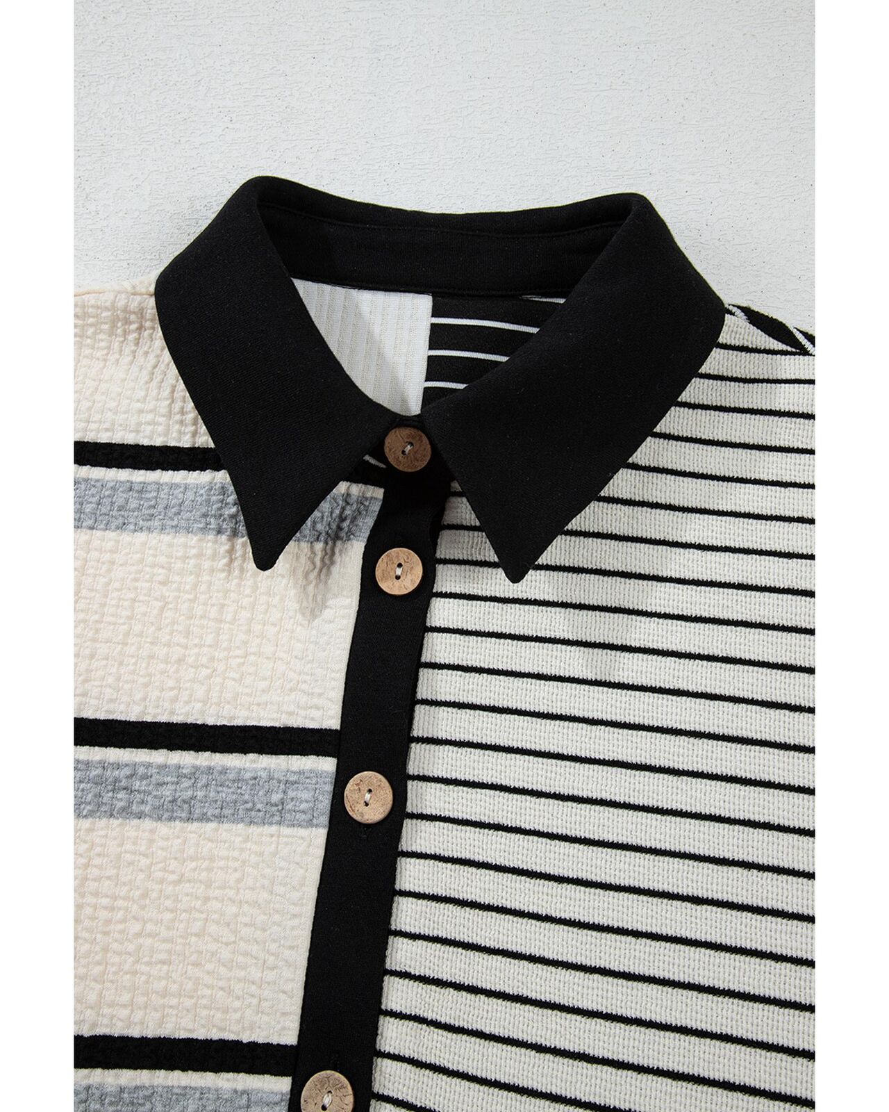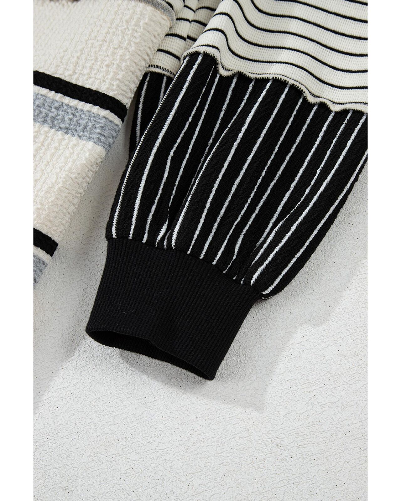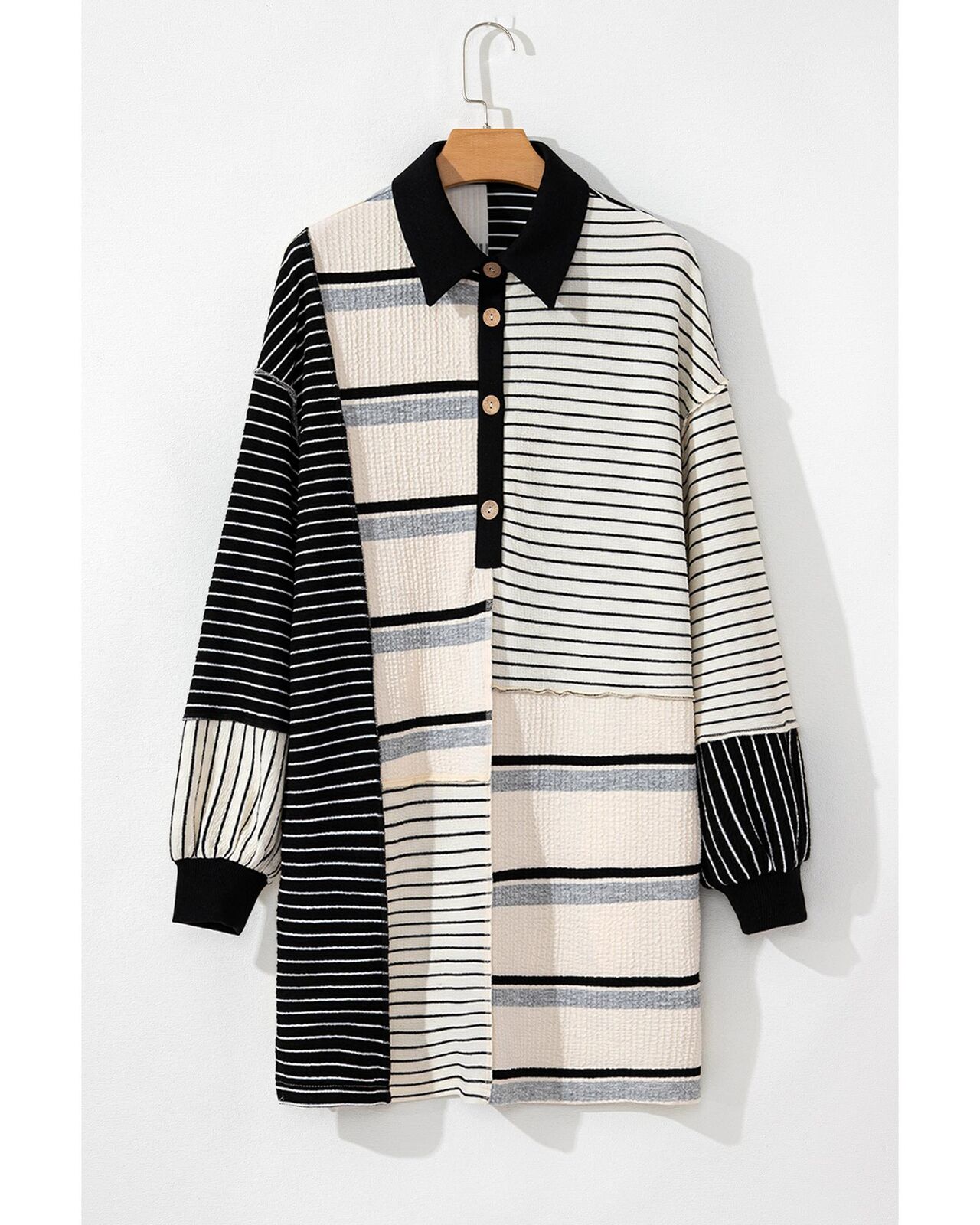 • Black Stripe Colorblock Knit Henley Collar Shift Long Sleeve Mini Dress