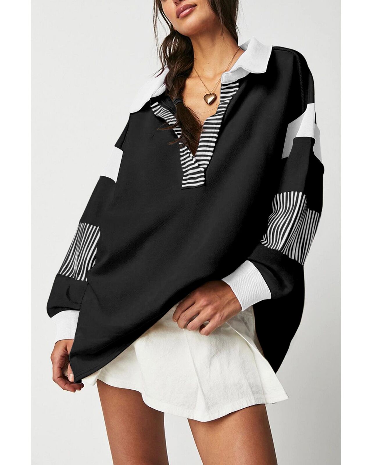 • Trendy Black Striped Colorblock Patchwork Collar Sweatshirt