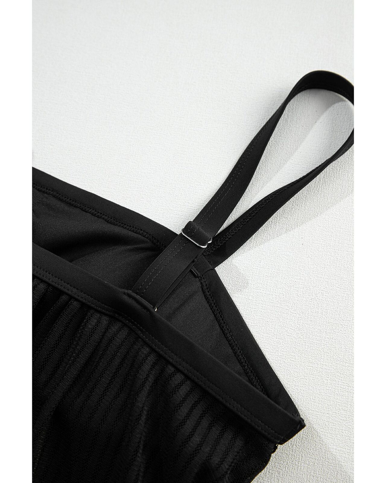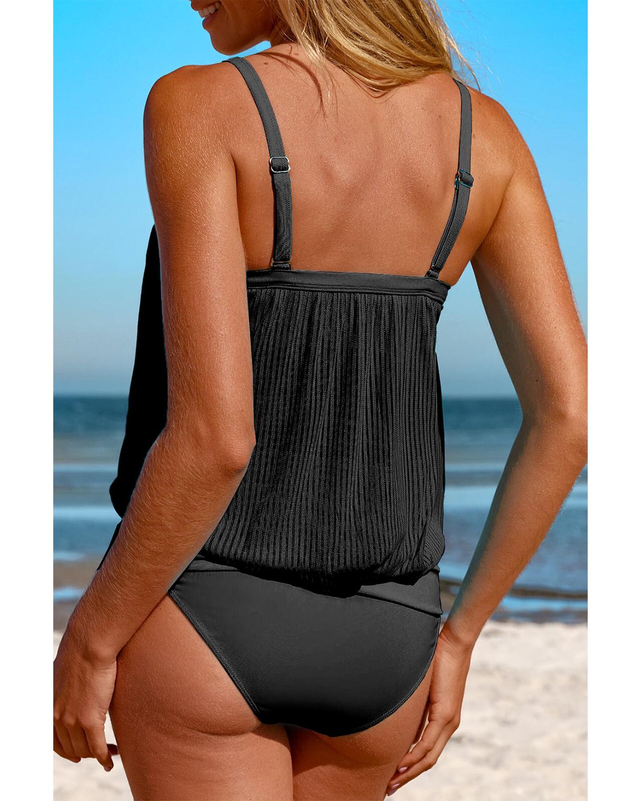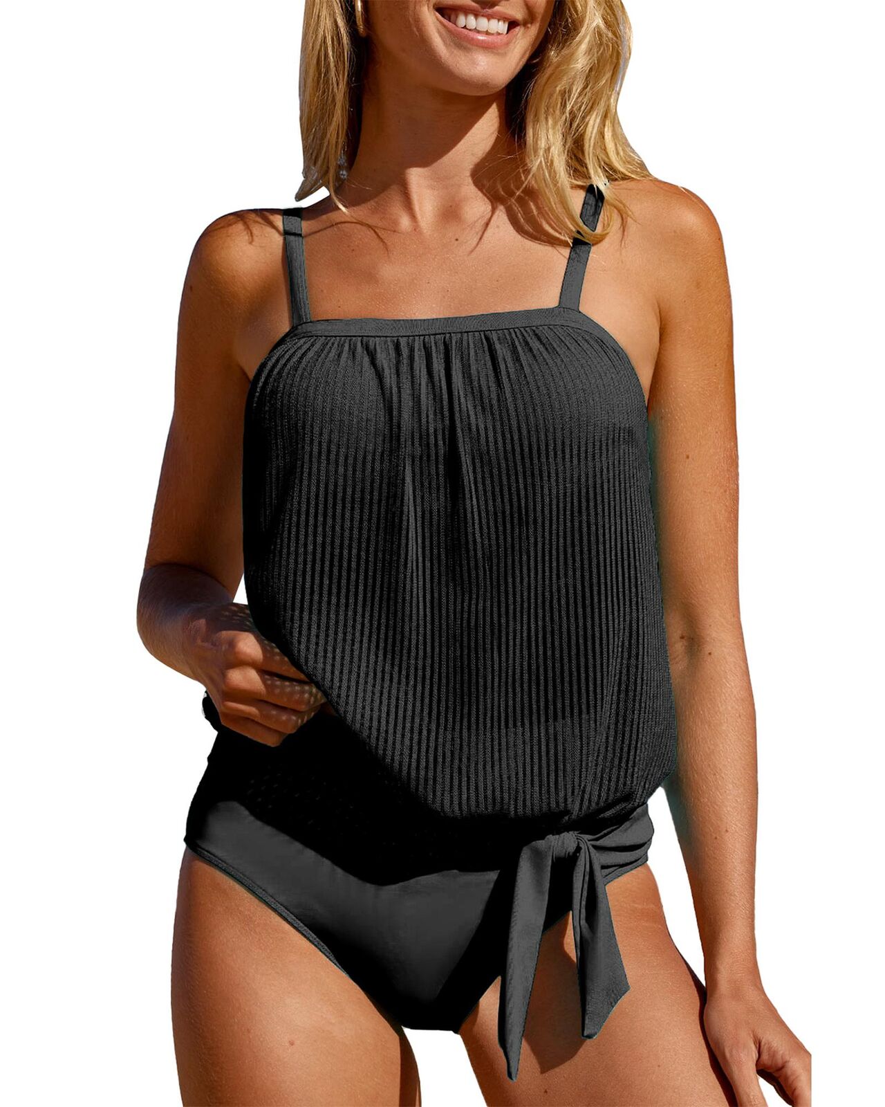 • Trendy Black Striped Mesh Knotted Hem Tankini Swimsuit