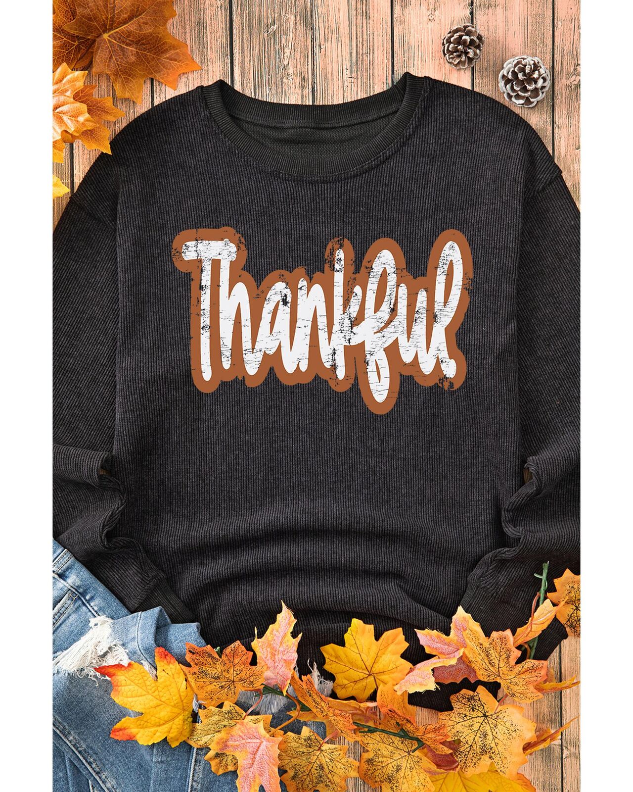 • Black Thankful Printed Drop Shoulder Corded Thanksgiving Sweatshirt