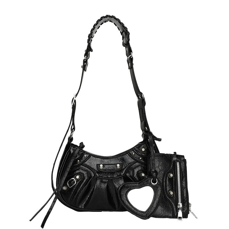 Black Vintage Rivet Crescent Moon Bag with Card Holder & Mirror, French Retro PU Leather Shoulder & Crossbody Motorcycle Bag for Women