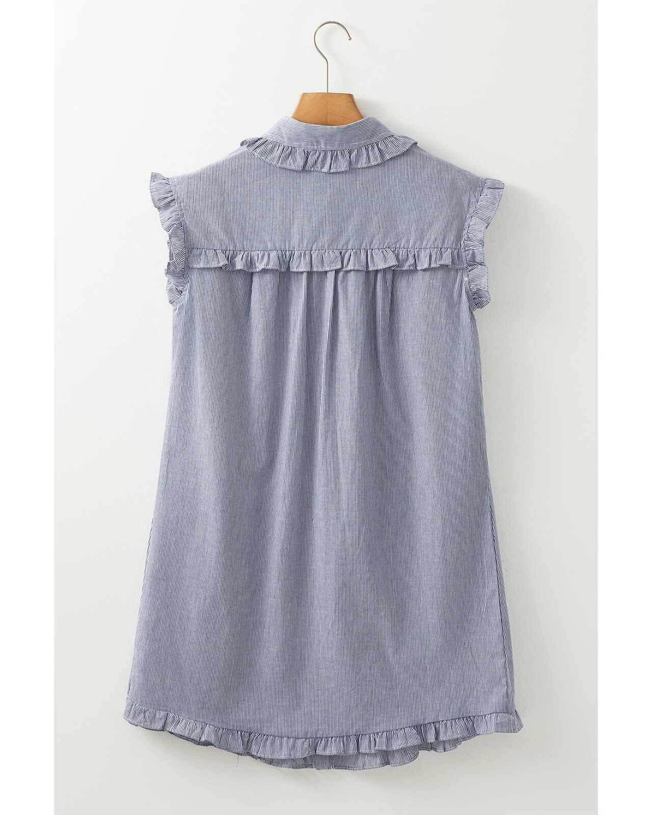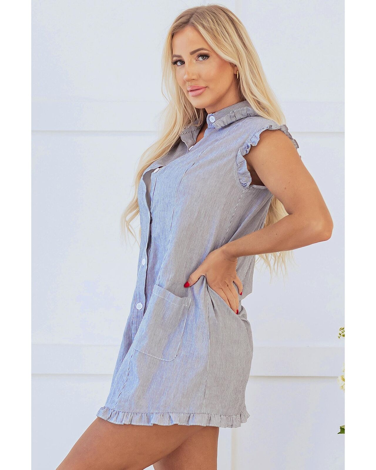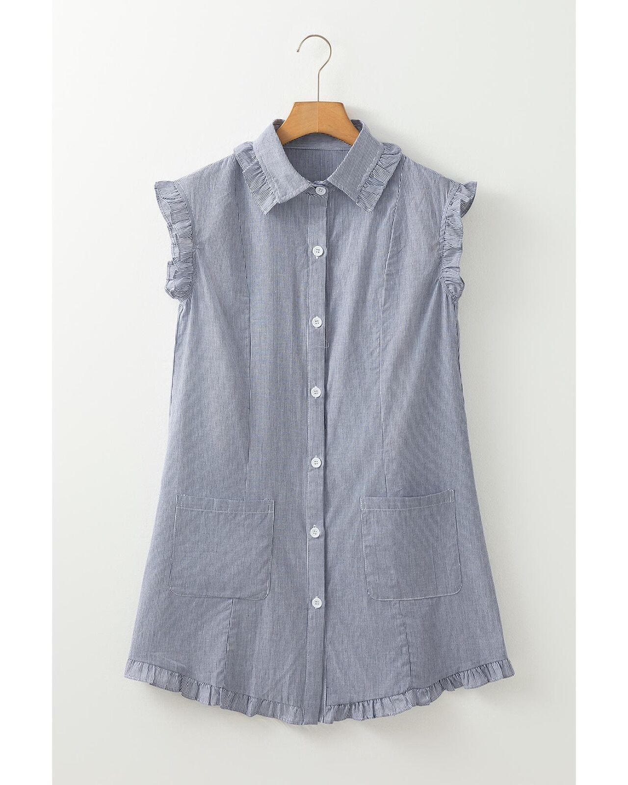 • Blue Stripe Frilled Sleeveless Collar Front Pocket Button Up Mini Dress