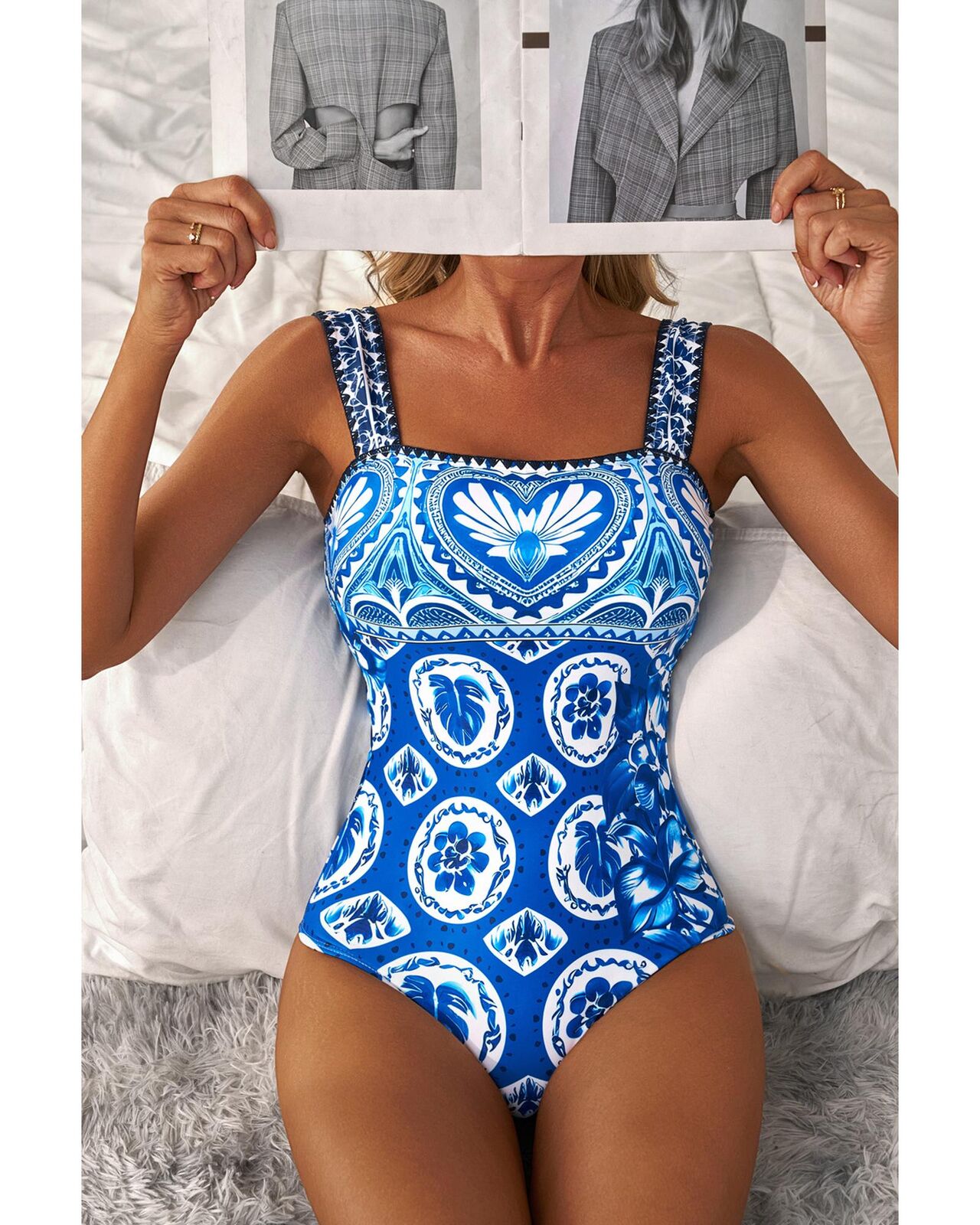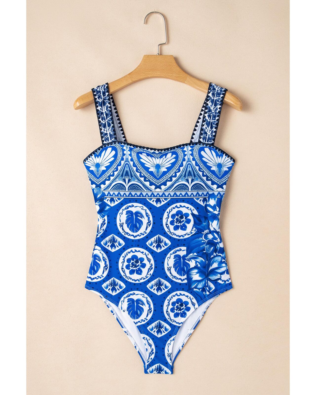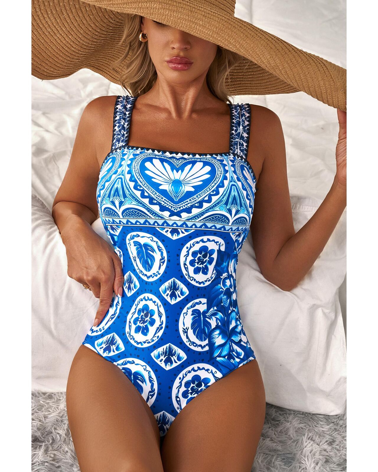 • Blue Tile Pattern Ricrac Wide Straps Sheath One Piece Swimsuit