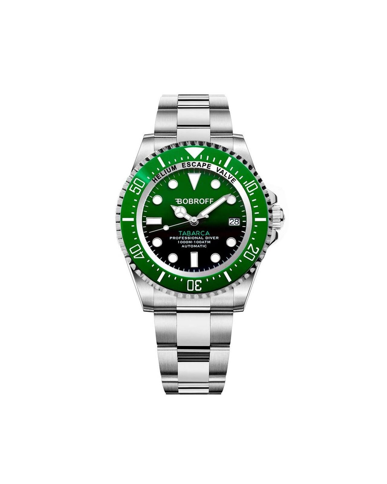 - json description: This Silver Stainless Steel Watch from the Tabarca collection combines elegance and functionality. Featuring an automatic NH35 caliber mechanism a brushed and polished 316L stainless steel case and a 44mm dial diameter this timepiece is designed for durability and style. The watch boasts a green dial with luminescent needles and indices in light blue covered by a 4.5mm sapphire crystal with anti