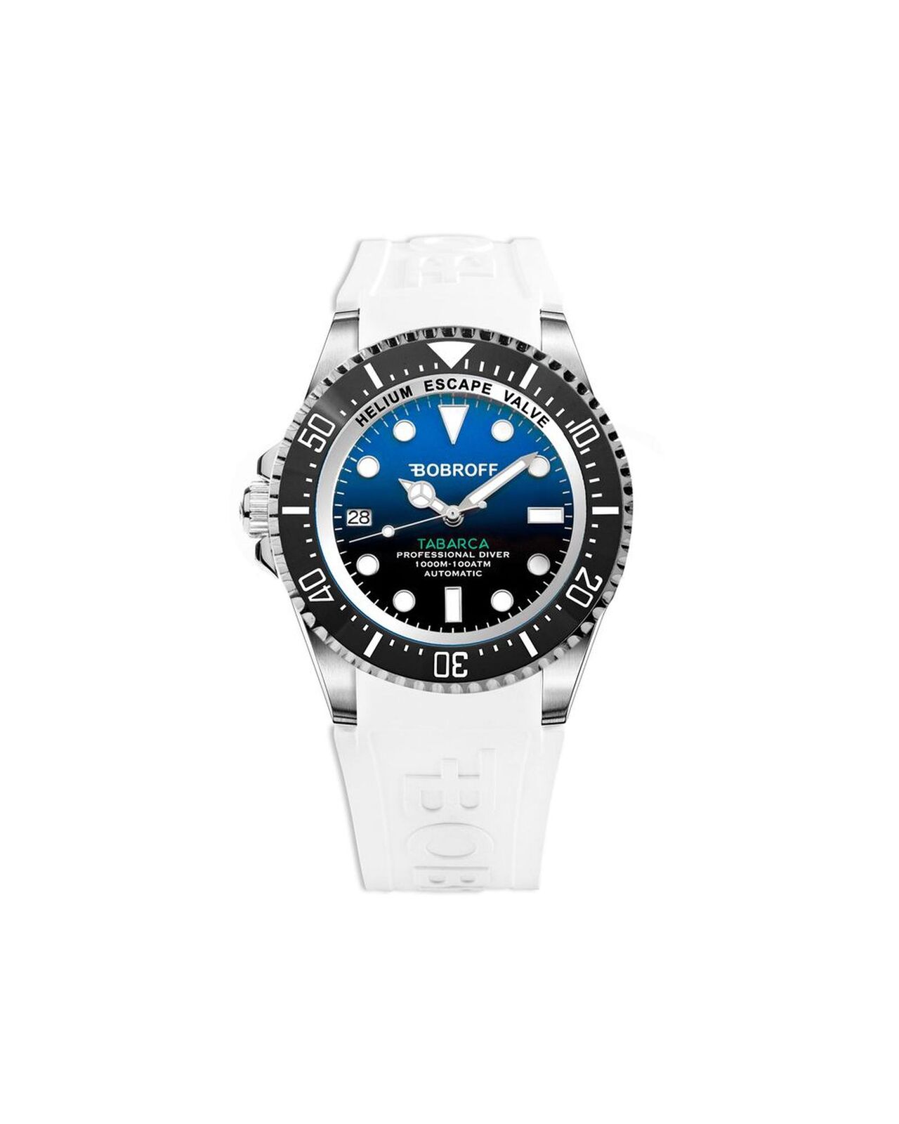 - json description: The White Rubber Watch is a sophisticated timepiece designed for those who seek both style and functionality. This watch features an automatic mechanism with an analogical display housed in a robust stainless steel case. The sleek silver case contrasts beautifully with the blue dial all protected by a durable sapphire glass. The white rubber bracelet ensures a comfortable fit making it perfect for everyday wear. This watch is part of the Tabarca collection and boasts a water resistance of up to 100ATM making it suitable for various water activities. bullet_description: title: White Rubber Watch description:
