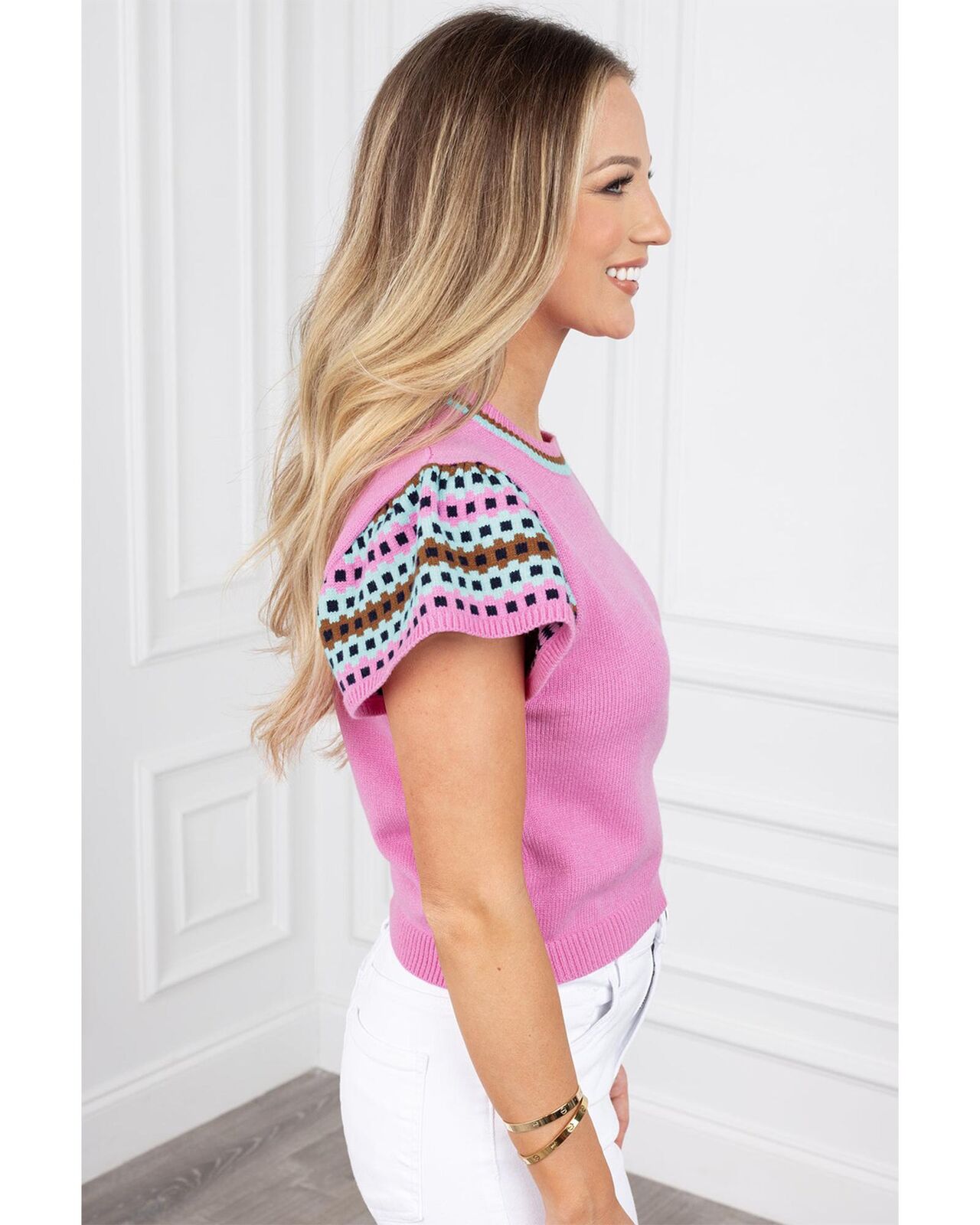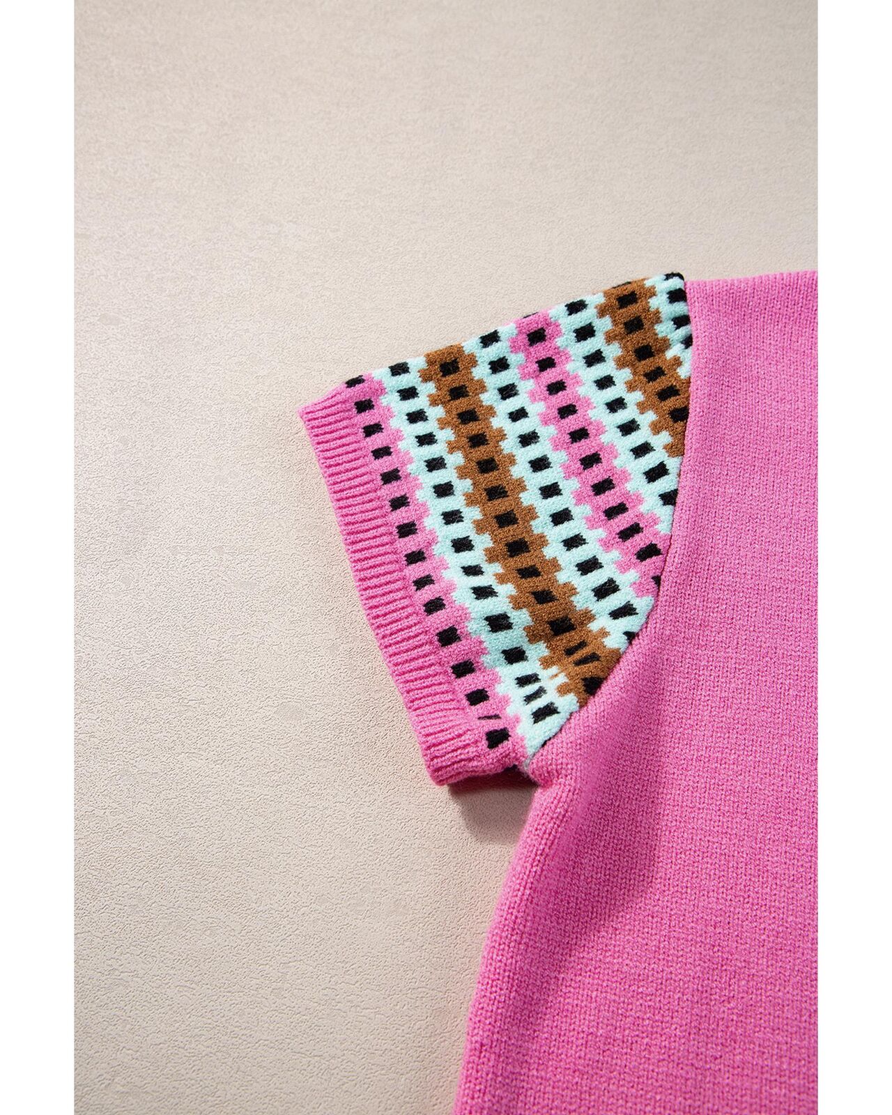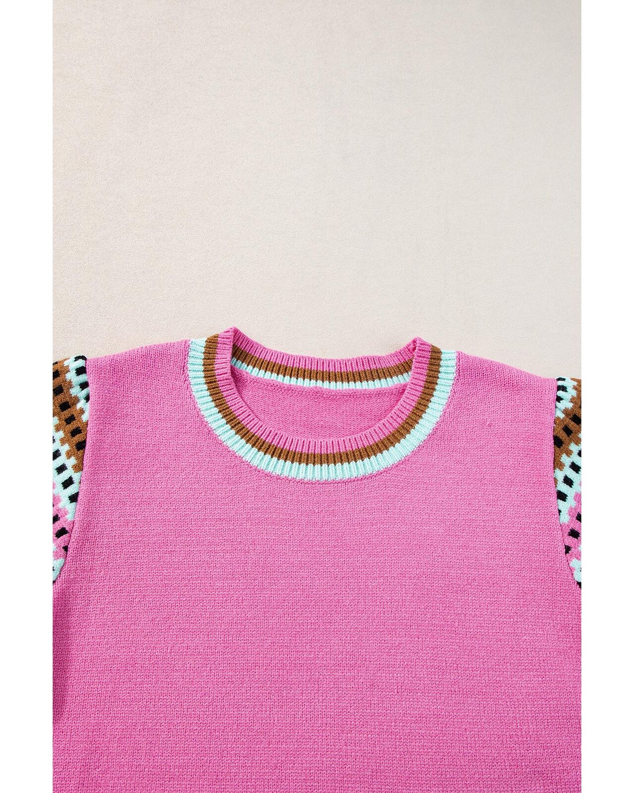 • Bright pink contrast printed cap sleeves crewneck sweater