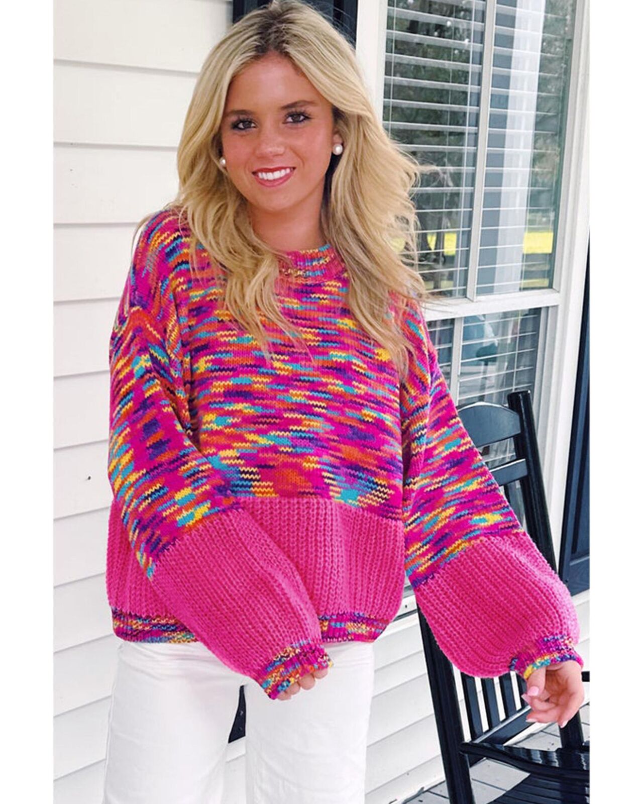 • Bright Pink Rainbow Confetti Drop Shoulder Sweater