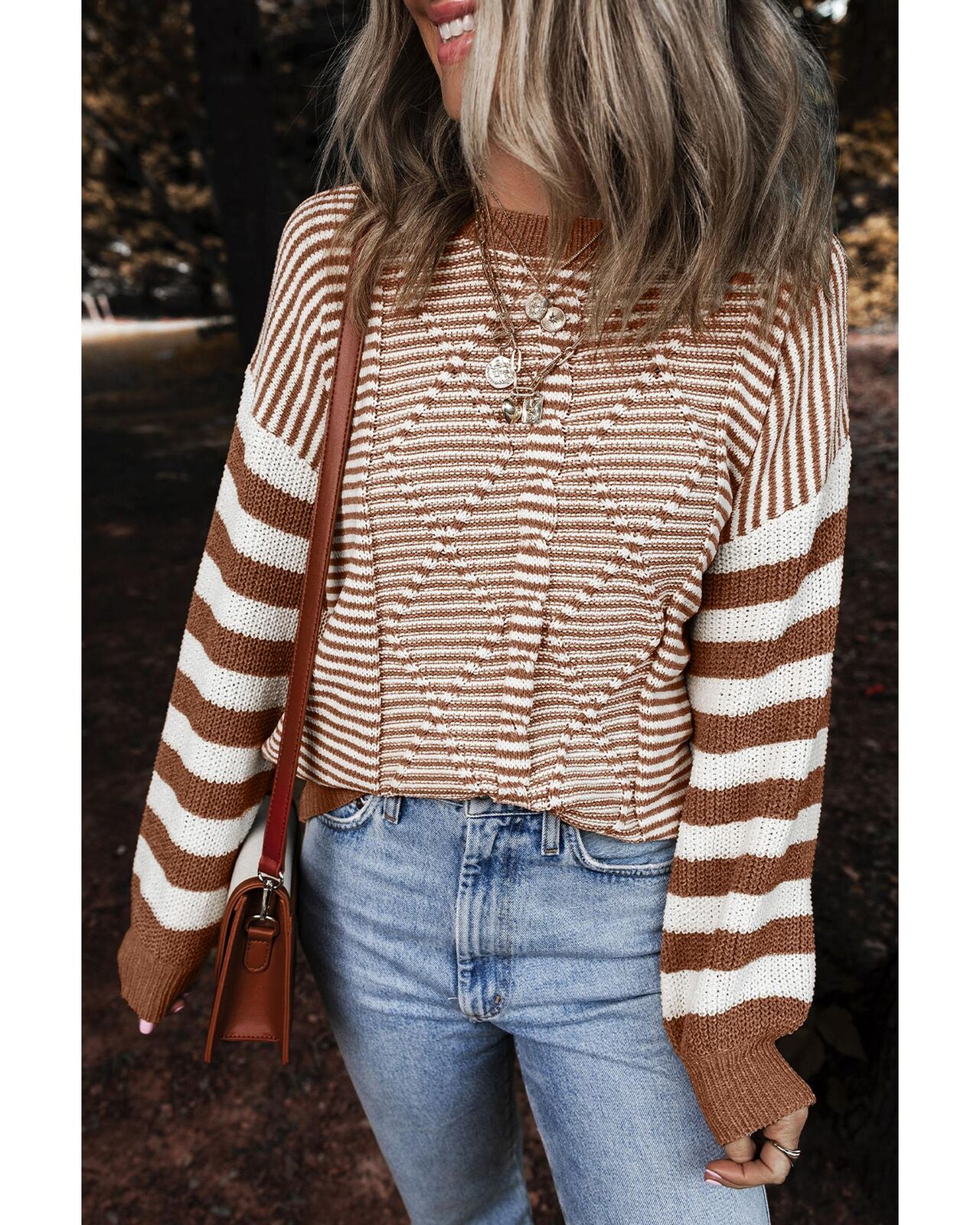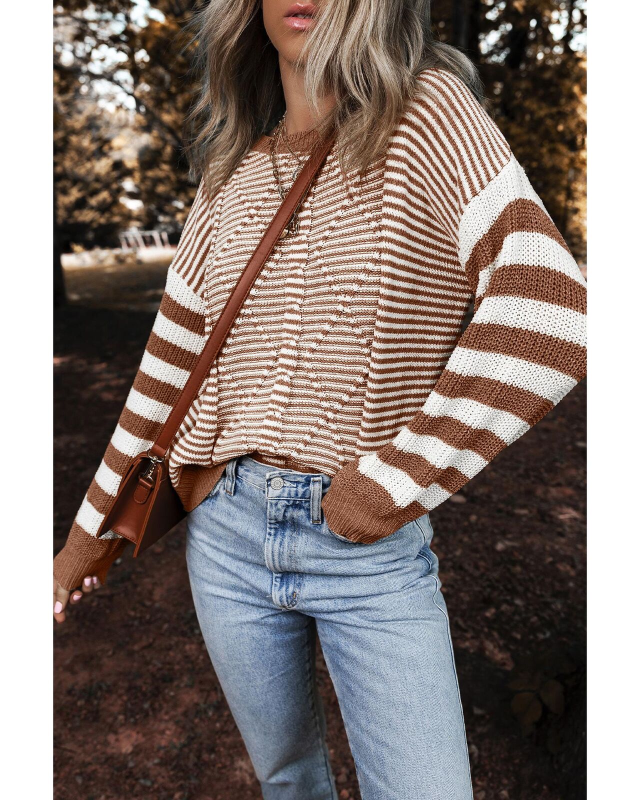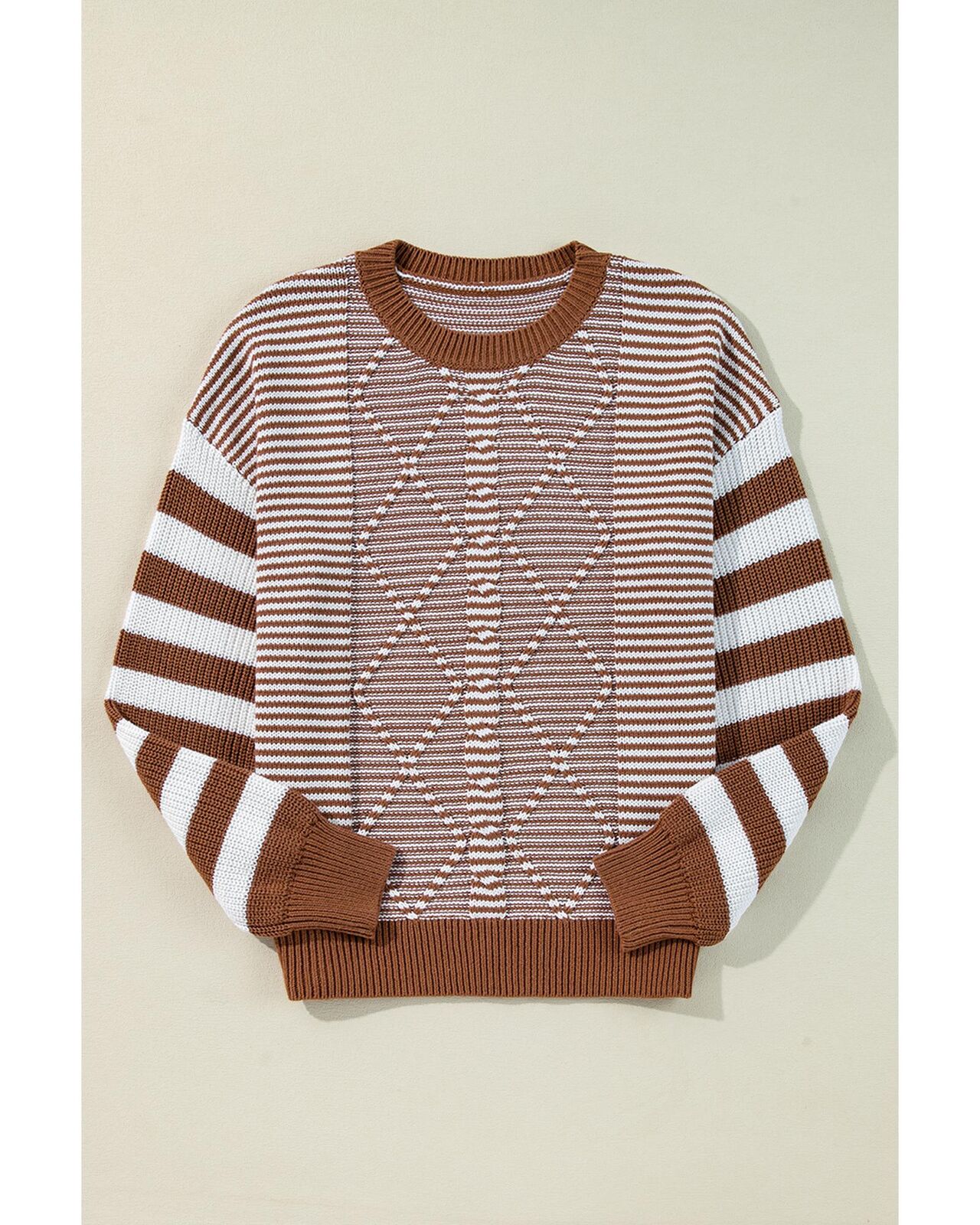 • Brown Stripe Geometric Textured Drop Shoulder Sweater