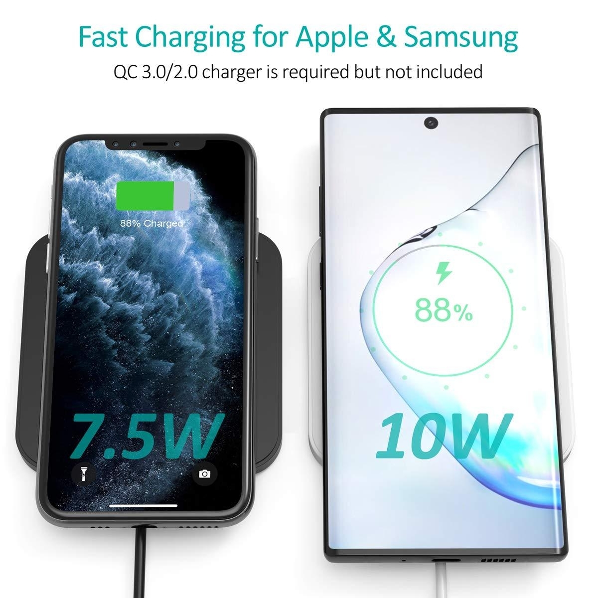 7. 5W fast wireless charging compatible with Apple iPhone 11/11 Pro/11 Pro Max/XS/XS Max/XR/X/8/ 8 Plus, 10W for Samsung Galaxy S10/ S10 / S10 E/ Note10/Note 9/S9/S9 Plus, S8/S8 Plus/Note 8, Note 5, S6 edge , S7/S7 edge (Tips:QC 2.0/3.0 Adapter is required for fast charging, but NOT included). 5W for Huawei P30 Pro, Huawei Mate 20/RS, Air Pods 2/pro case and any Qi-enabled devices.
