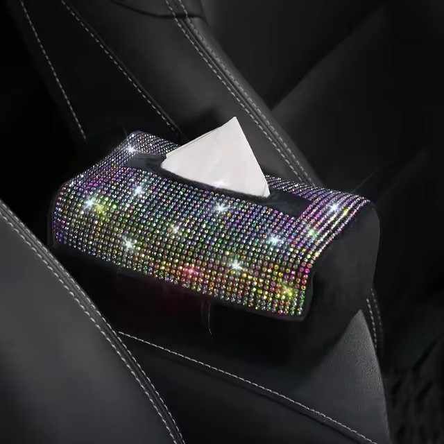 Elevate your car's interior with this dazzling rhinestone-covered tissue box holder. Designed to attach to your car's visor, seat back, or armrest box, this accessory offers both style and functionality. Keep tissues within easy reach while adding a touch of glamour to your vehicle.