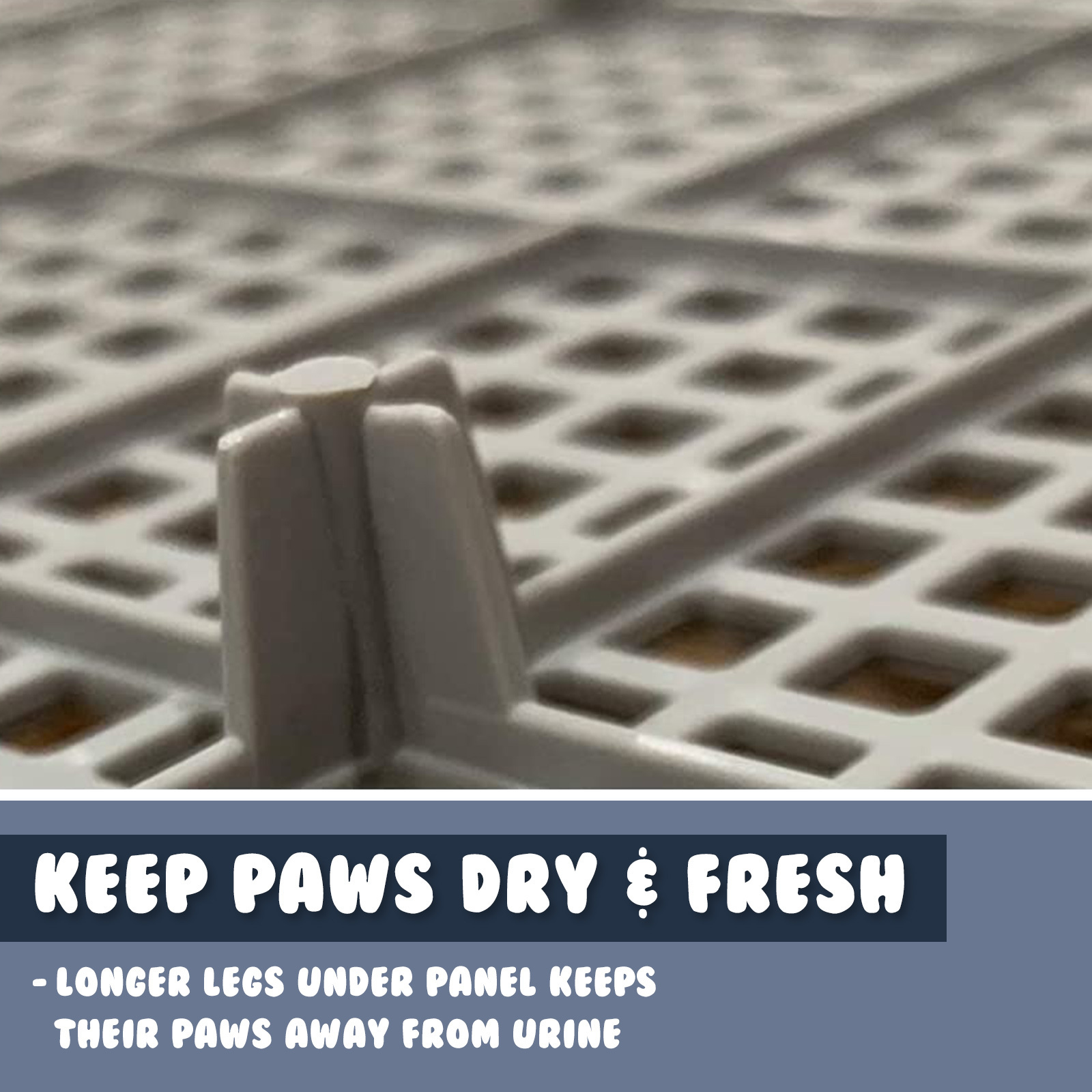 KEEP THOSE PUPPY PAWS FRESH: Perforated grate/mesh panel allows pee to flow down to your own pads underneath, and the panel legs are long to keep paws almost dry.