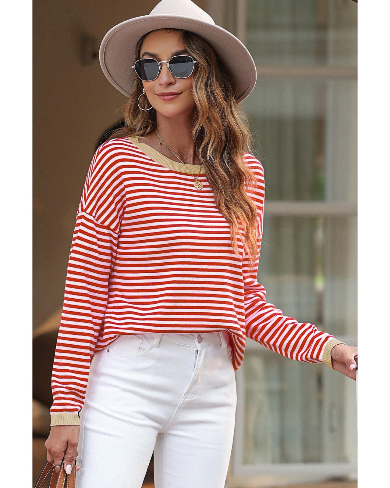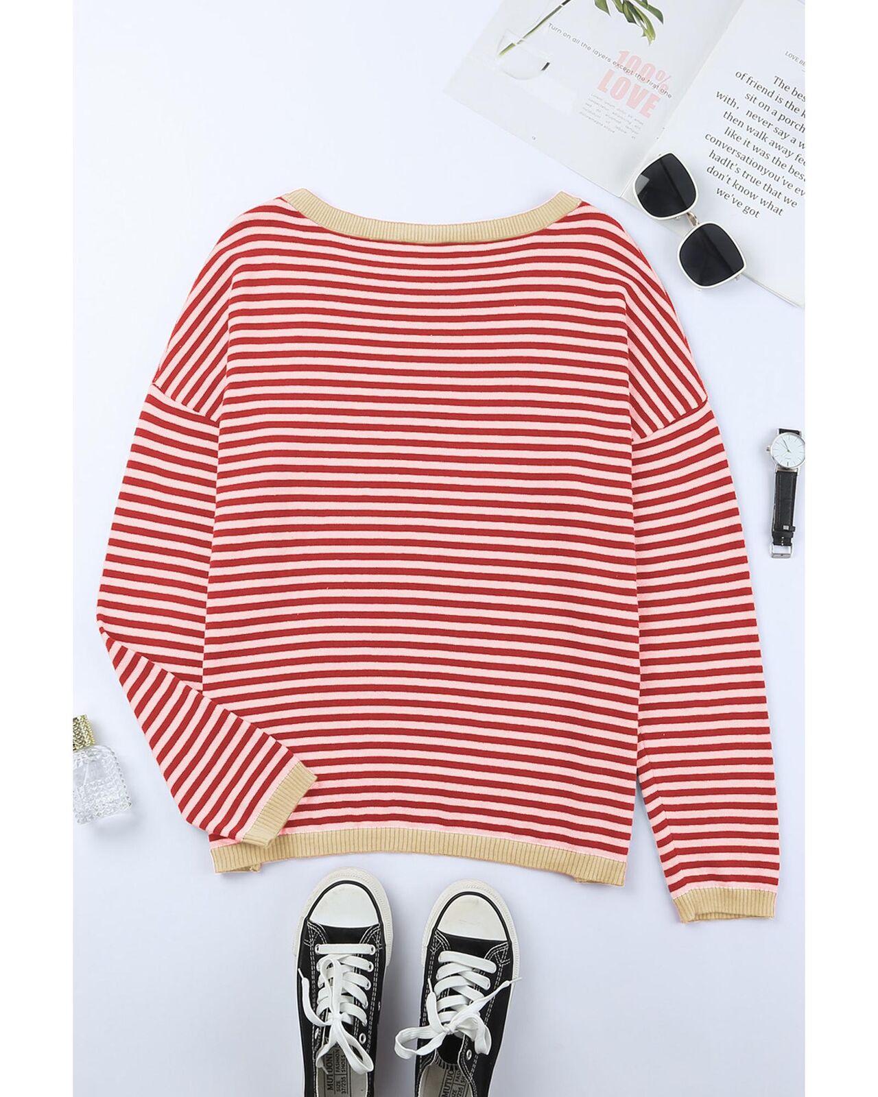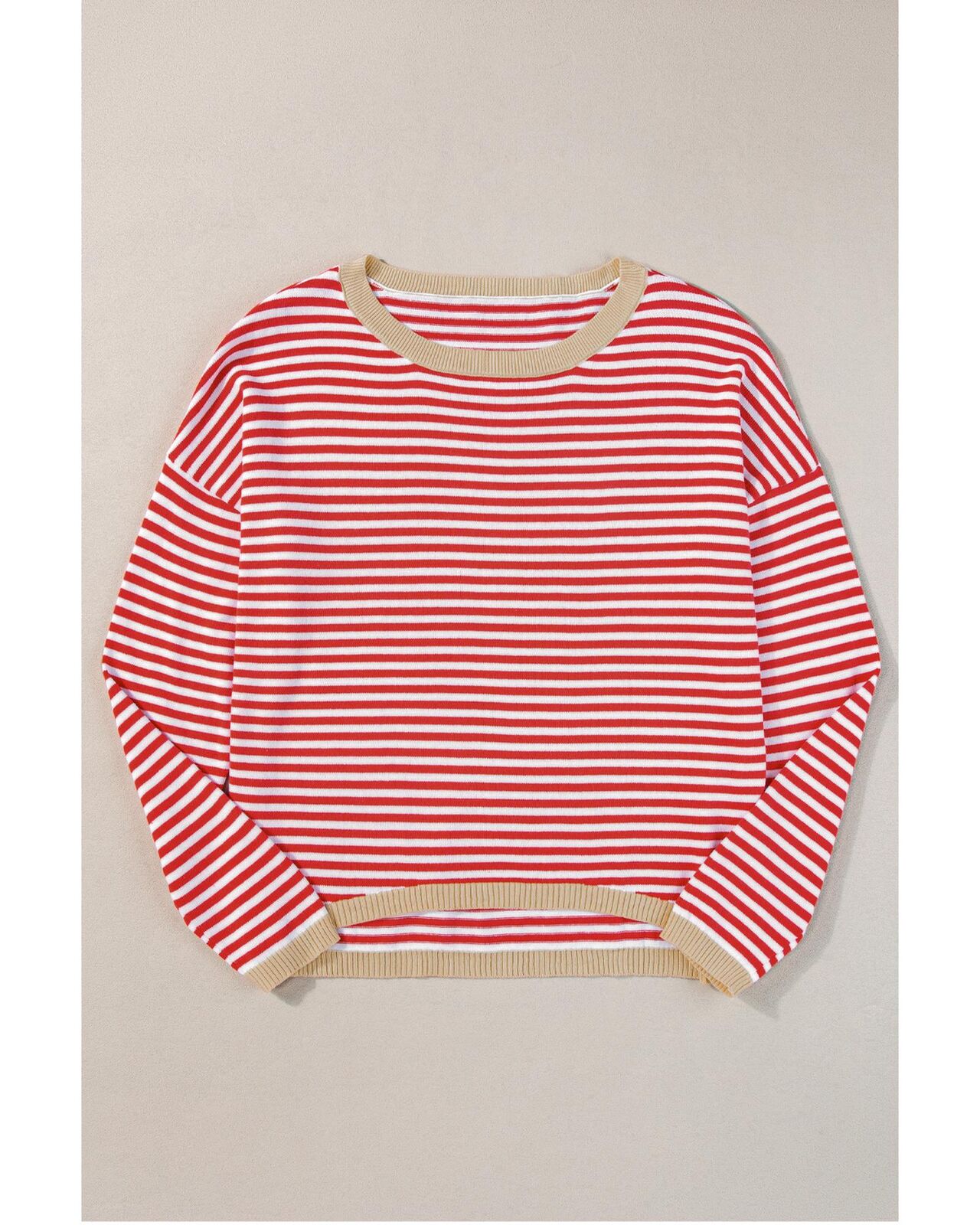 • Fiery Red Contrast Trimmed Striped Drop Shoulder Sweater