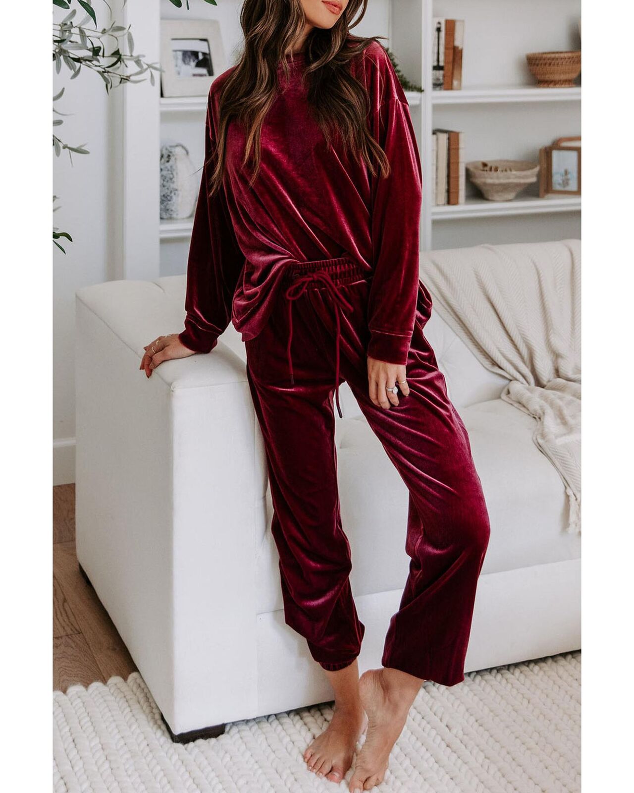 • Fiery Red Solid Velvet Two Piece Lounge Set
