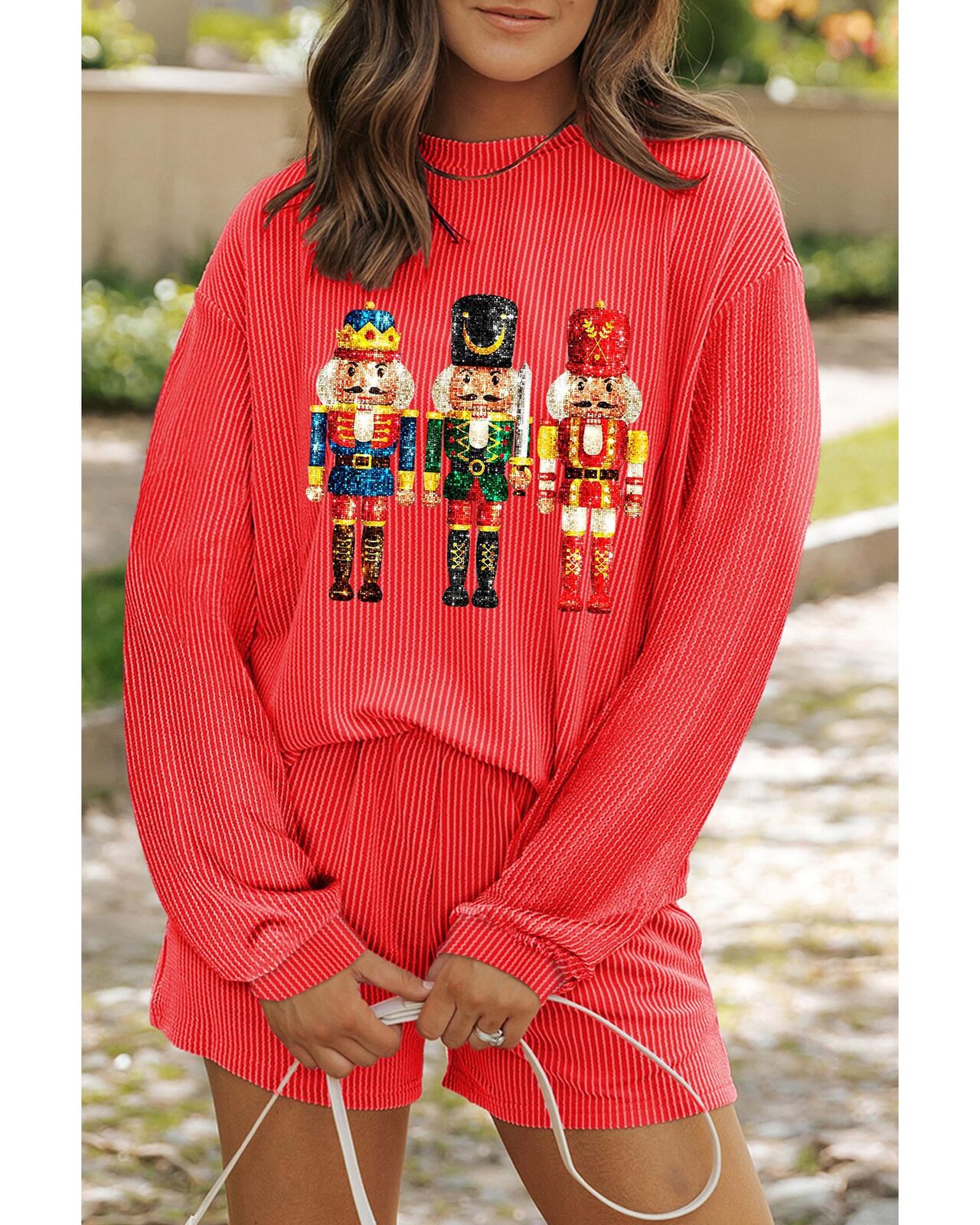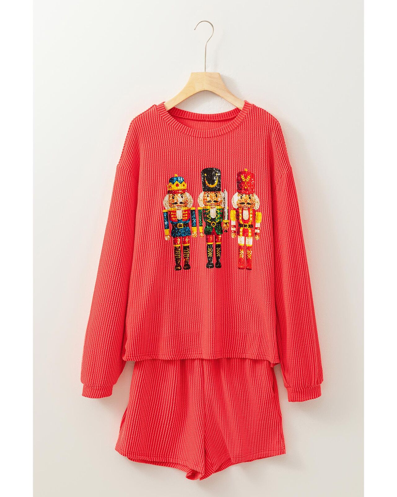 • Gold Flame Heat Transfer Christmas Nutcracker Ribbed Long Sleeve Top Shorts Set