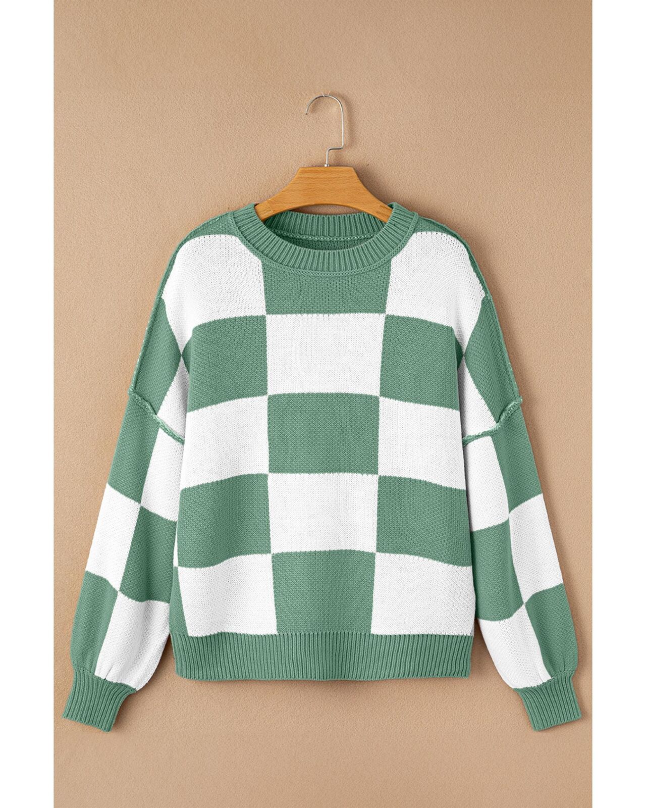 • Stylish Green Checkered Bishop Sleeve Sweater