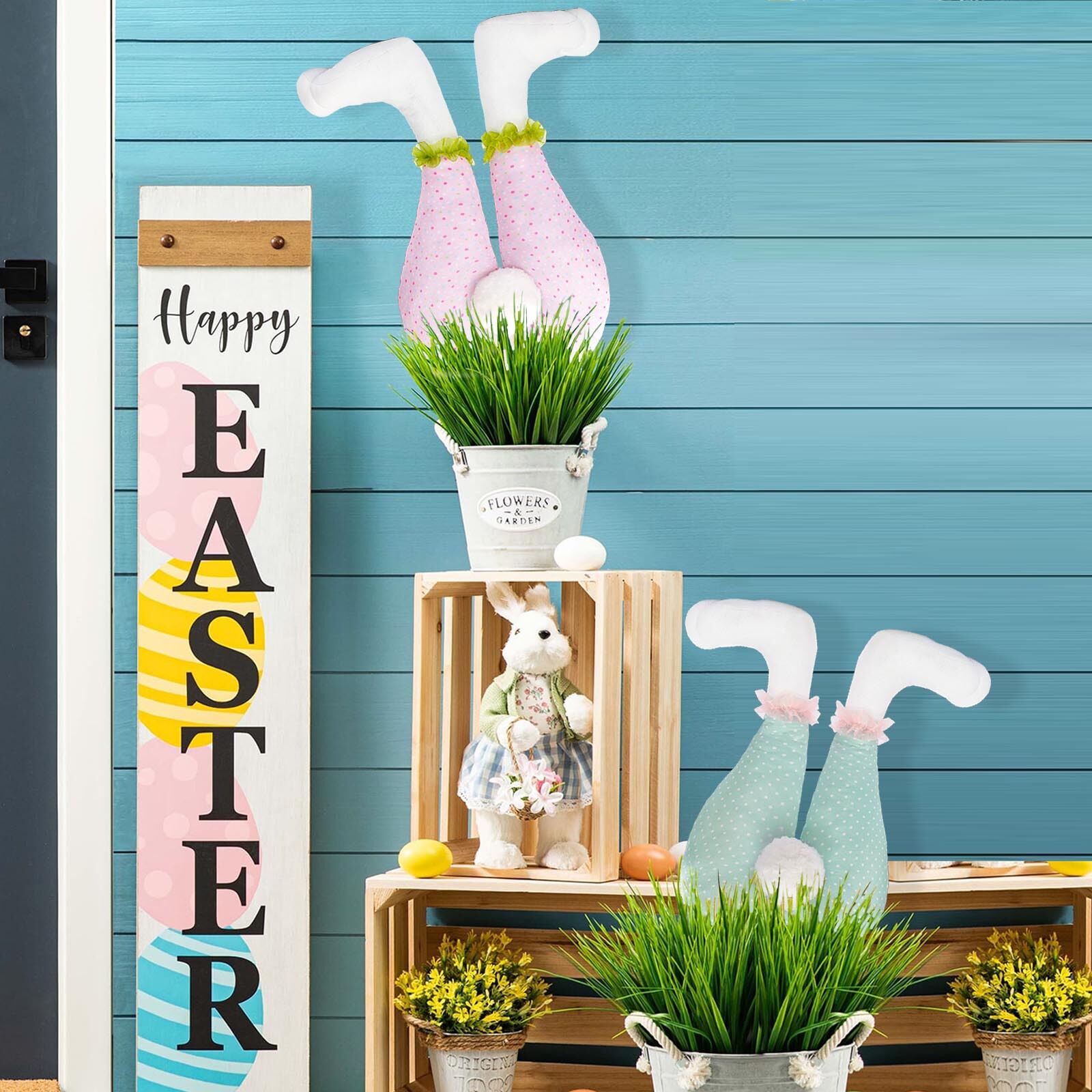 Add a whimsical touch to your Easter celebrations with the Easter Bunny Hanging Legs Decoration, a charming prop designed to enhance your home's festive scene. Featuring adorable bunny legs with a fluffy tail, this decoration hangs beautifully from a wreath or door, complemented by colorful eggs and floral accents. Perfect for creating a joyful holiday atmosphere.