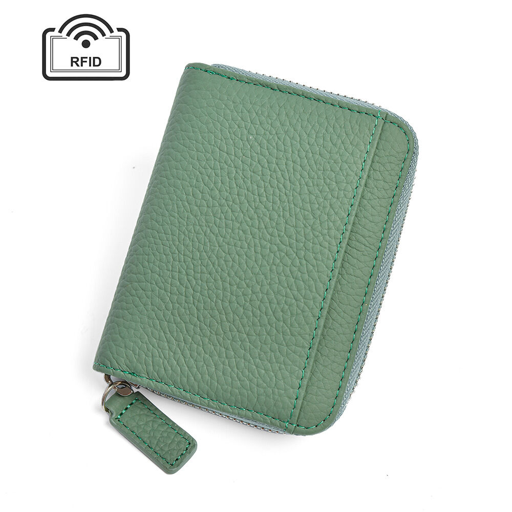 Green Genuine Leather Women’s Wallet – Short Accordion Card Holder with RFID Protection, Zippered Coin Purse in Cowhide Leather, Japanese Style