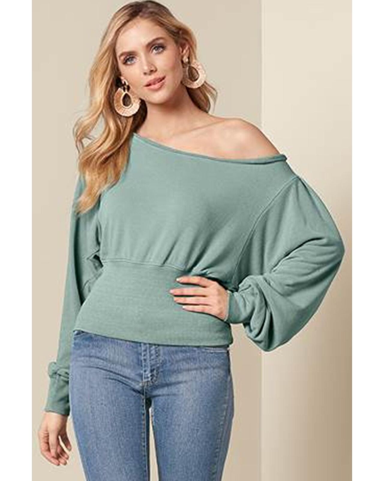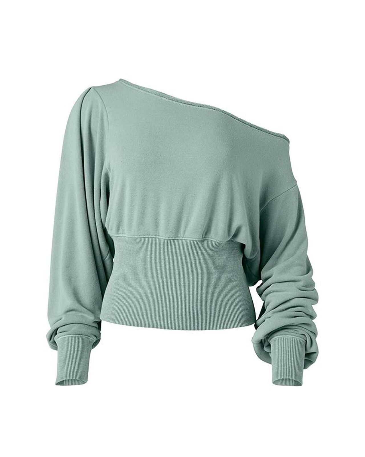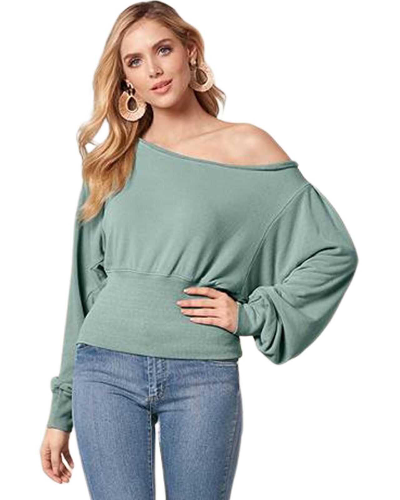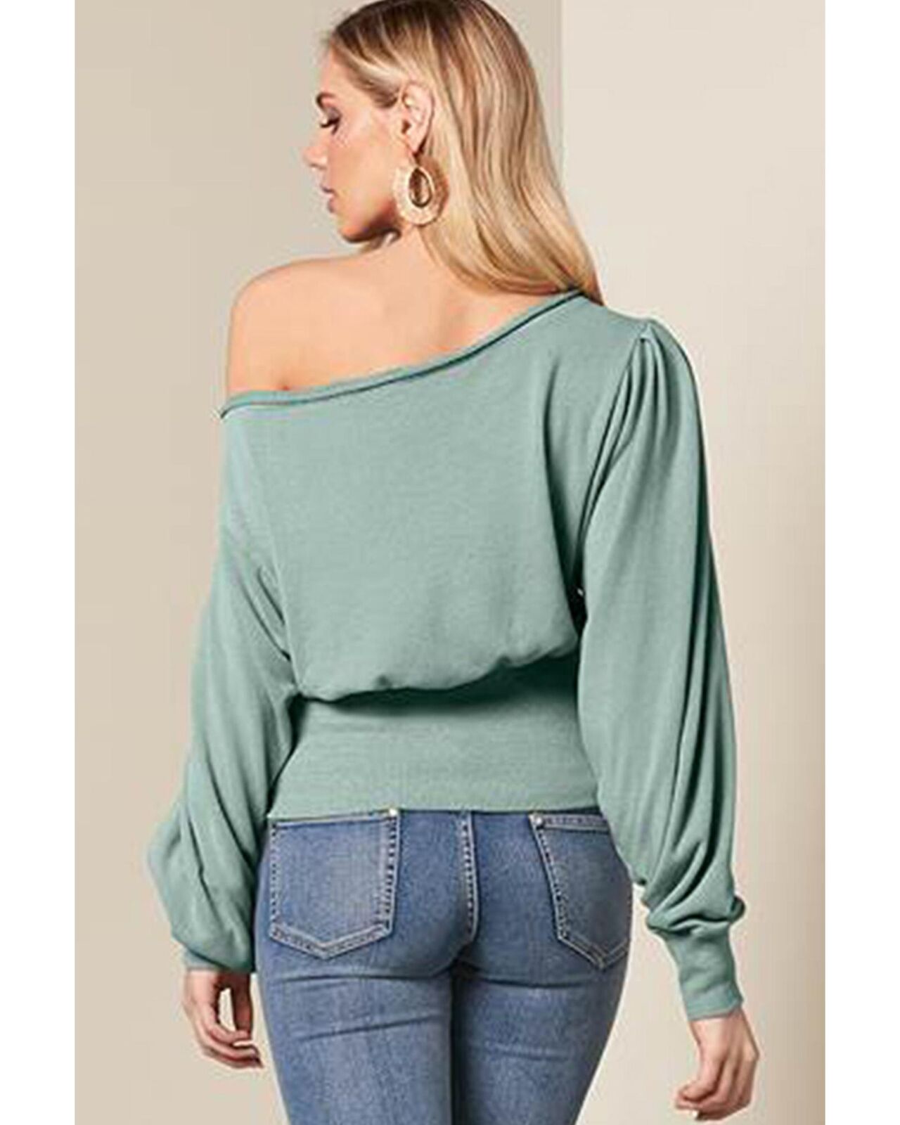 • Green Off Shoulder Bishop Sleeve Cinched Waist Blouse
