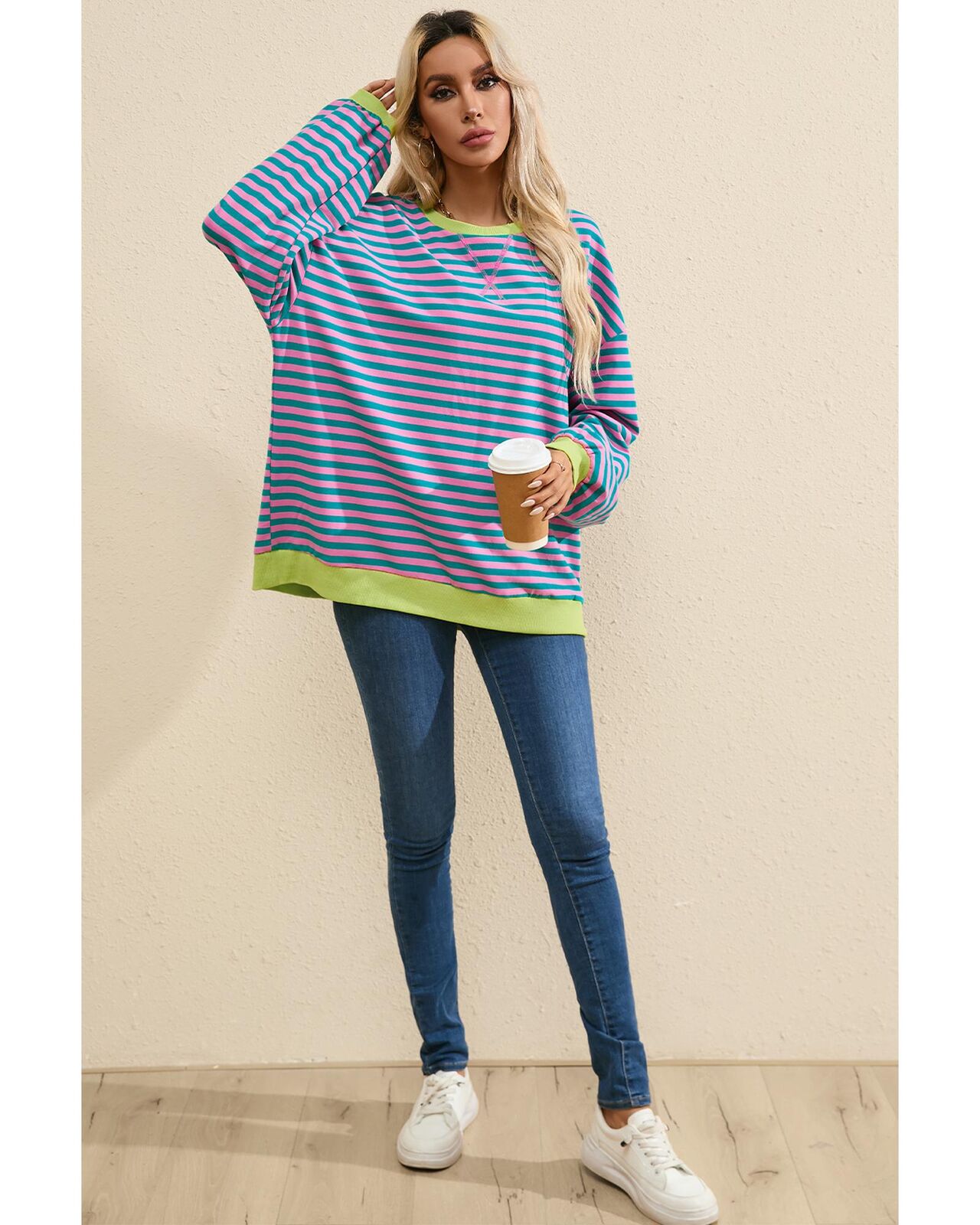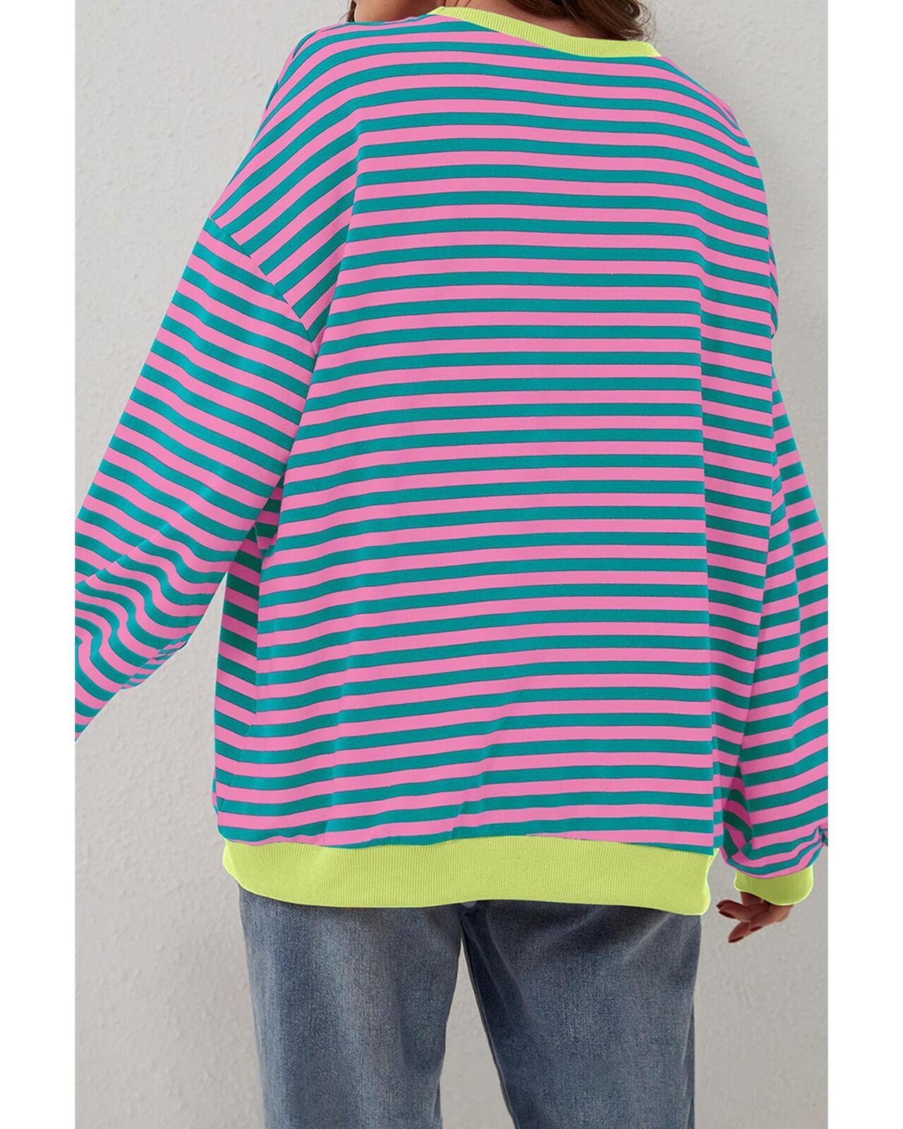 • Classic Green Stripe Oversized Contrast Trim Pullover Sweatshirt