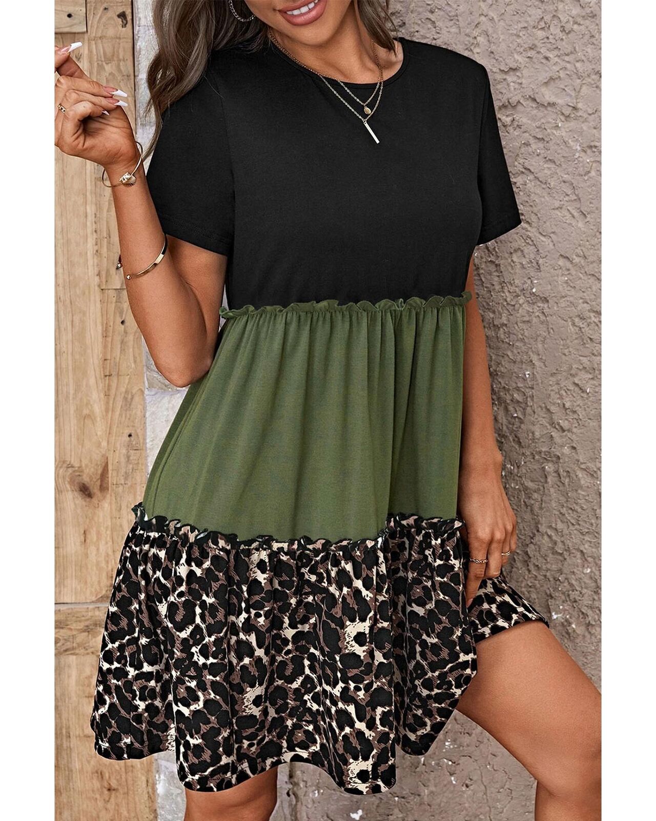 • Jungle Green Leopard Print Colorblock Frill Trim T