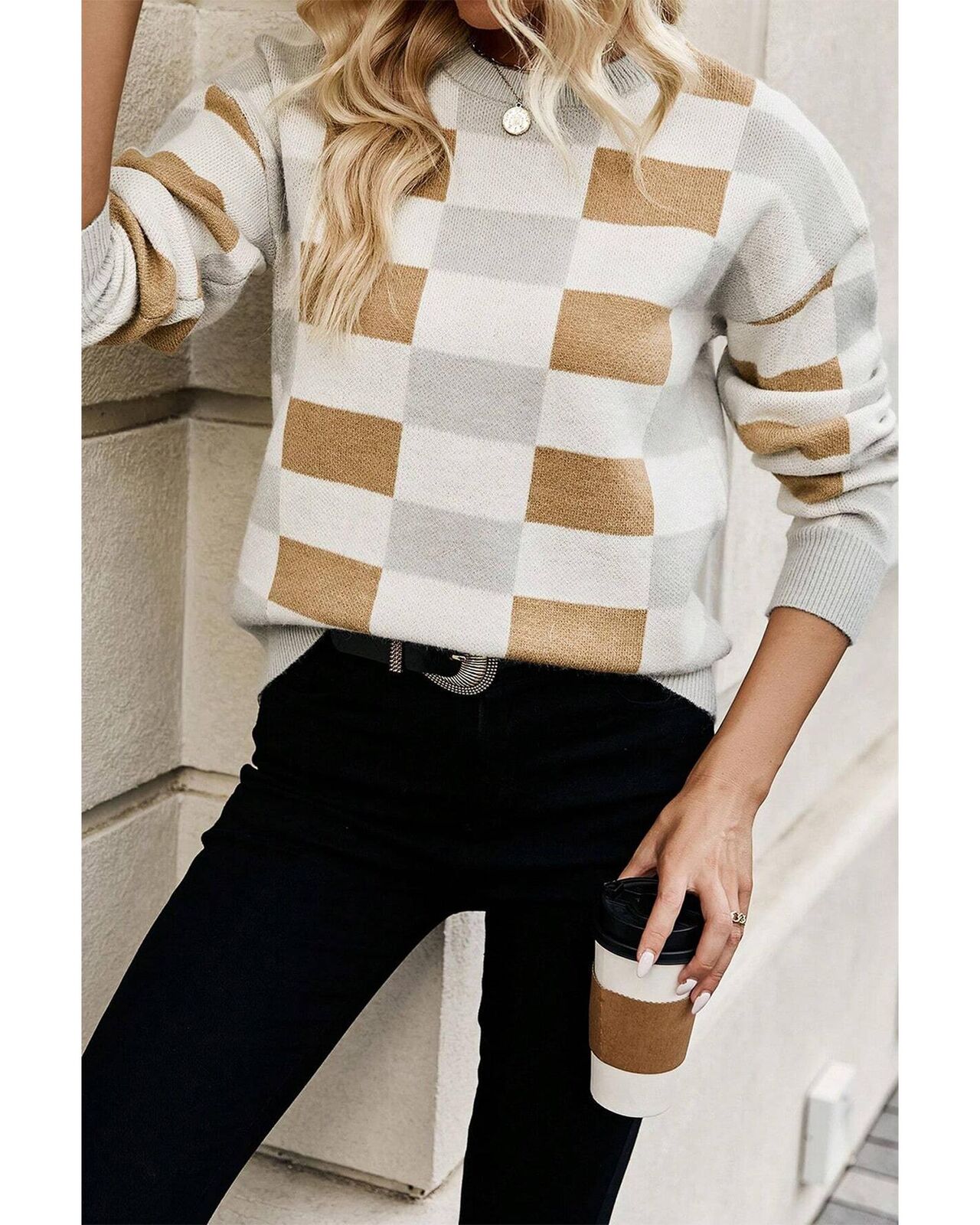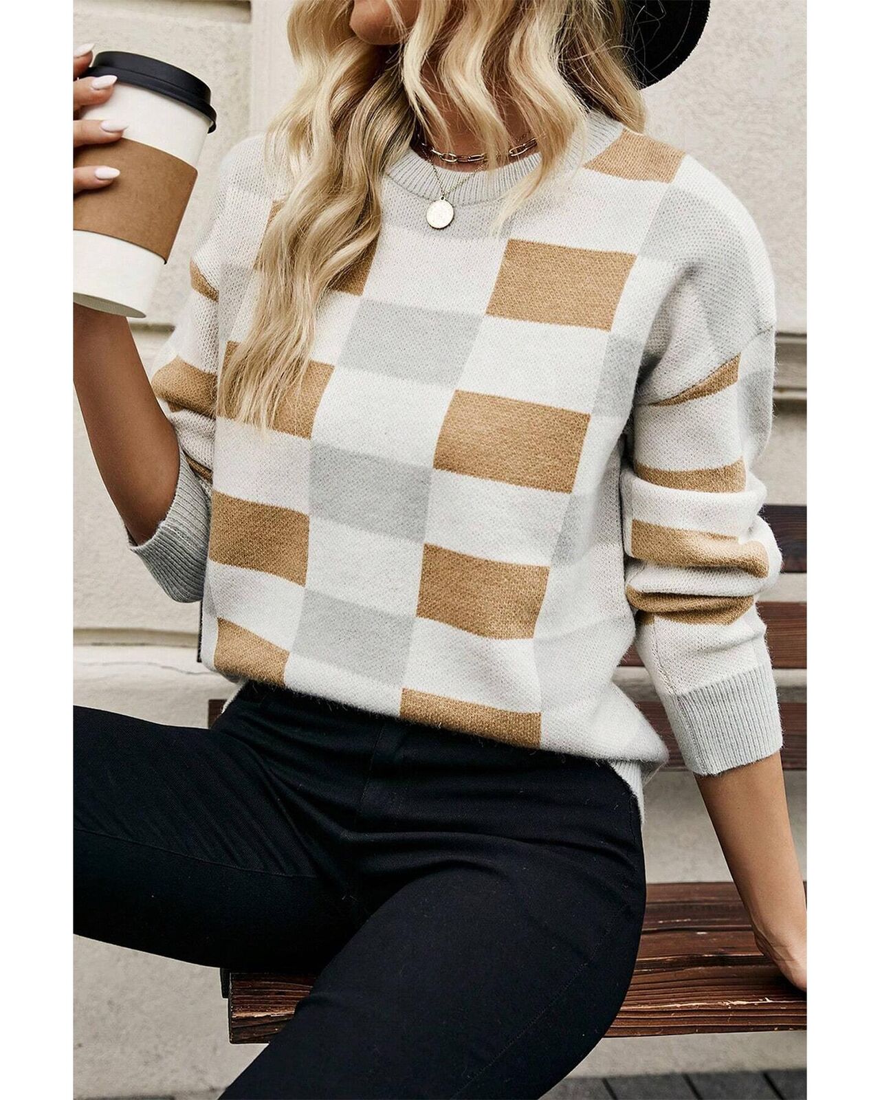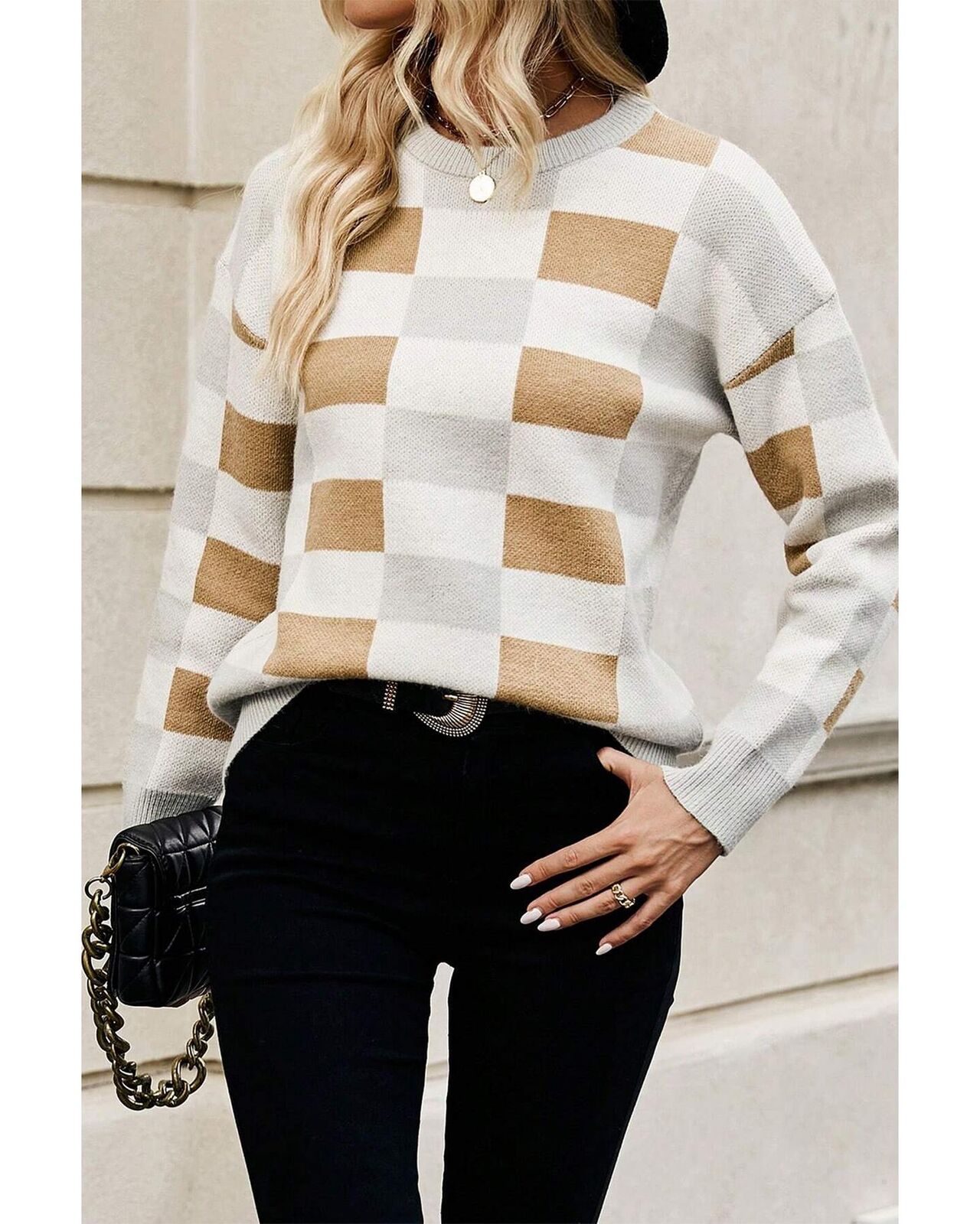 • Khaki Checkered Ribbed Edge O Neck Drop Shoulder Sweater