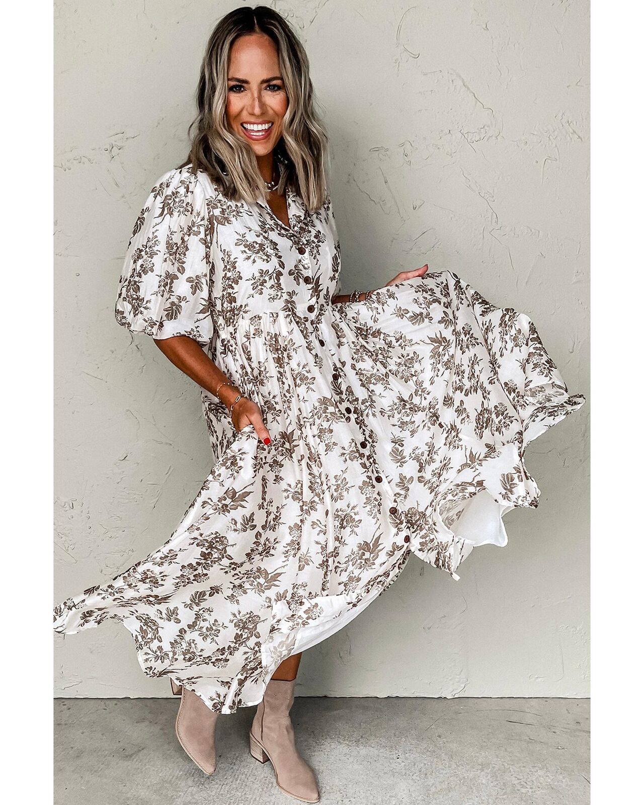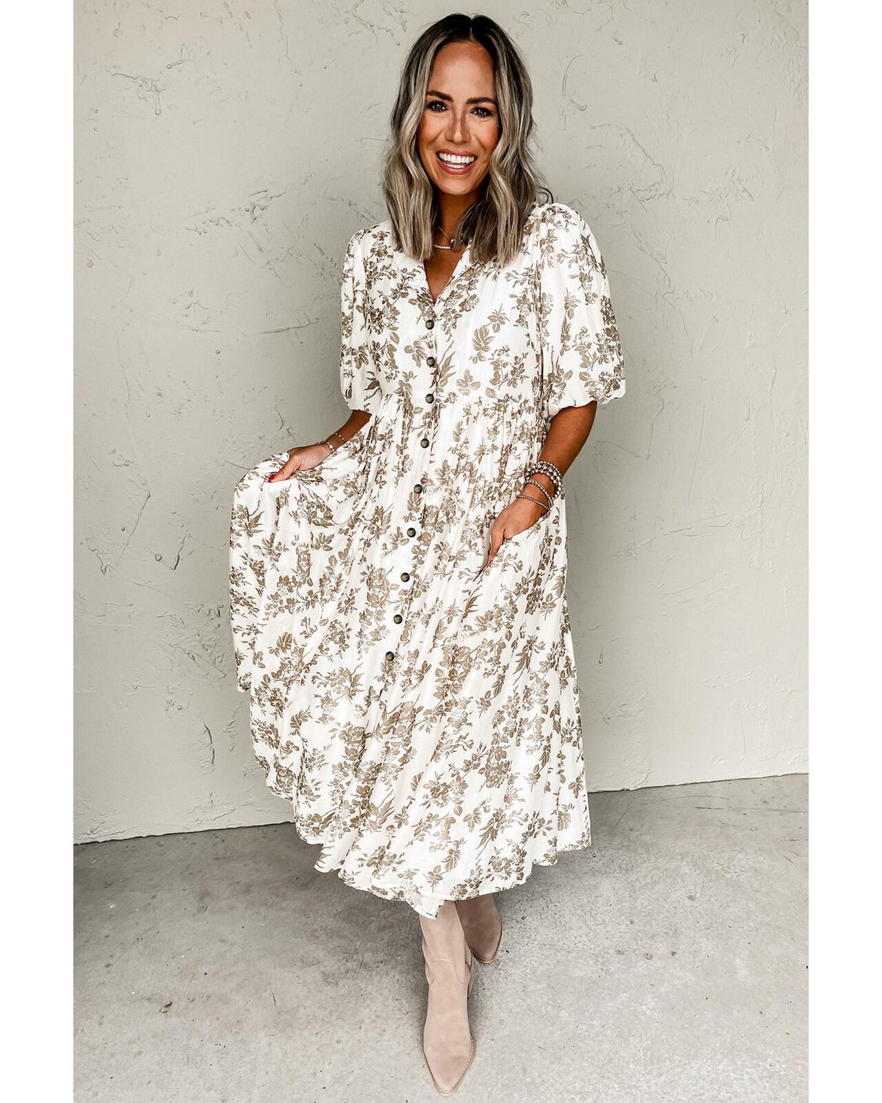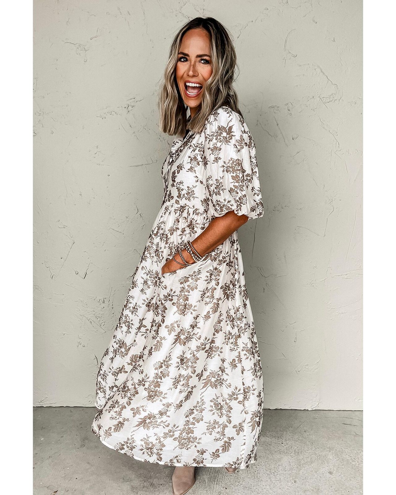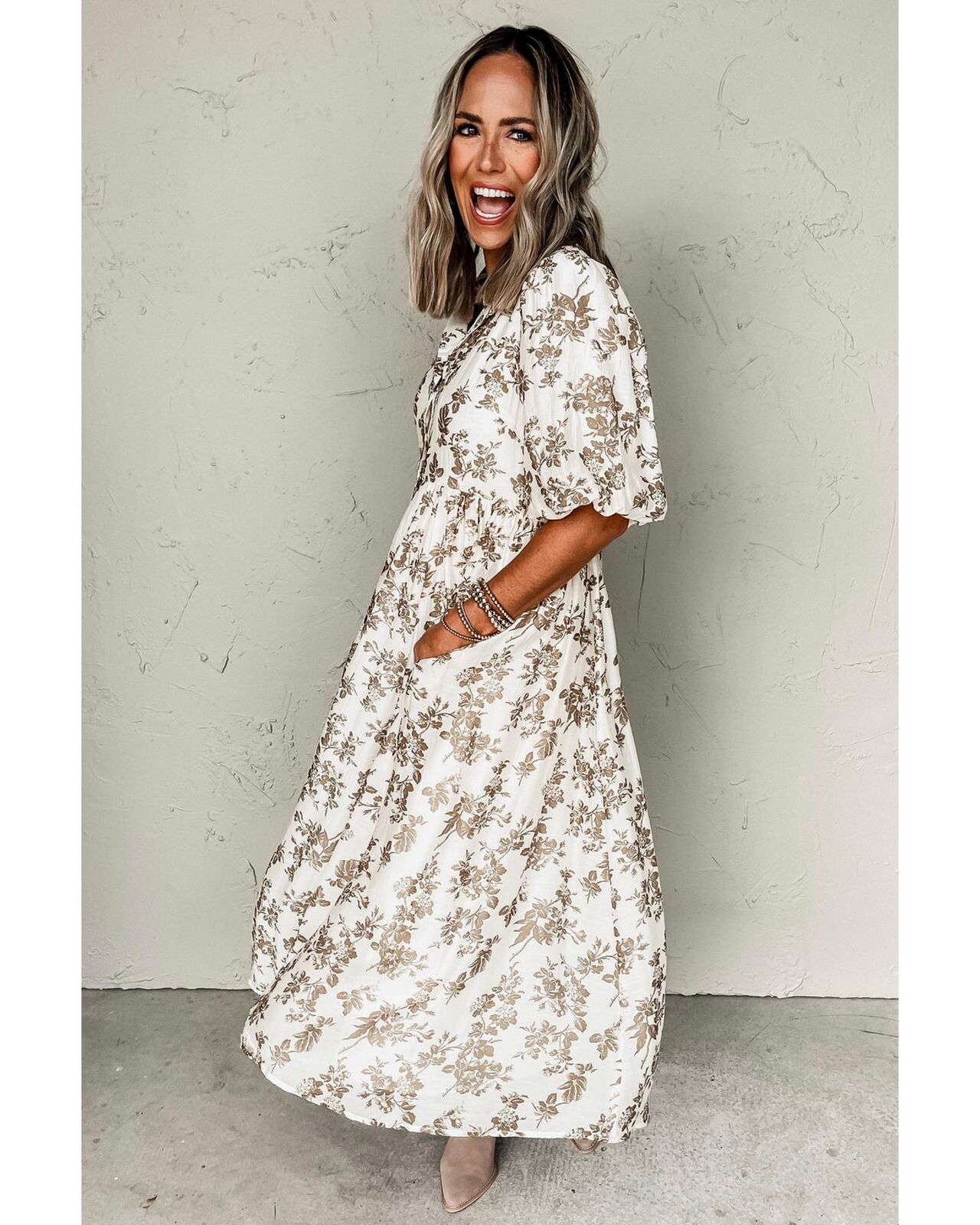 • Khaki floral puff sleeve v