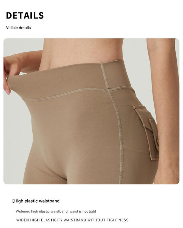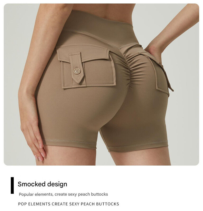 Khaki High-Waisted Yoga Shorts with Pockets for Women - Butt-Lifting, Breathable, and Comfortable Activewear M