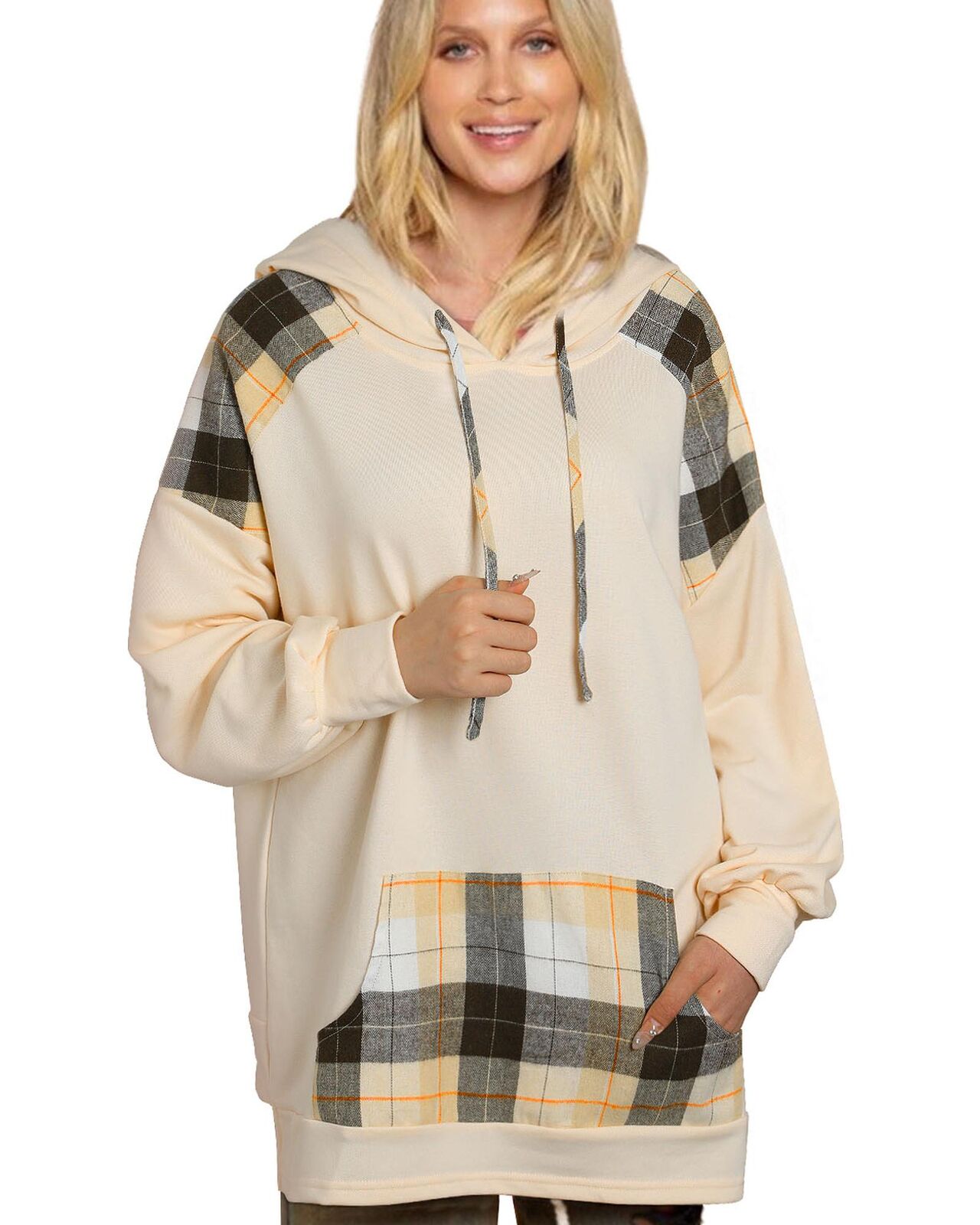 • Khaki Plaid Patchwork Kangaroo Pocket Oversized Hoodie