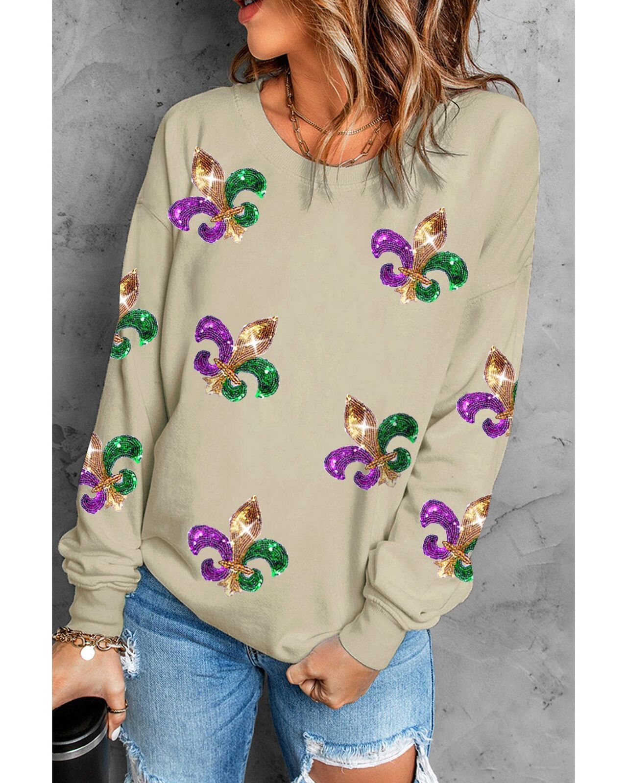 • catching Khaki Sequin Mardi Gras Graphic Pullover Sweatshirt