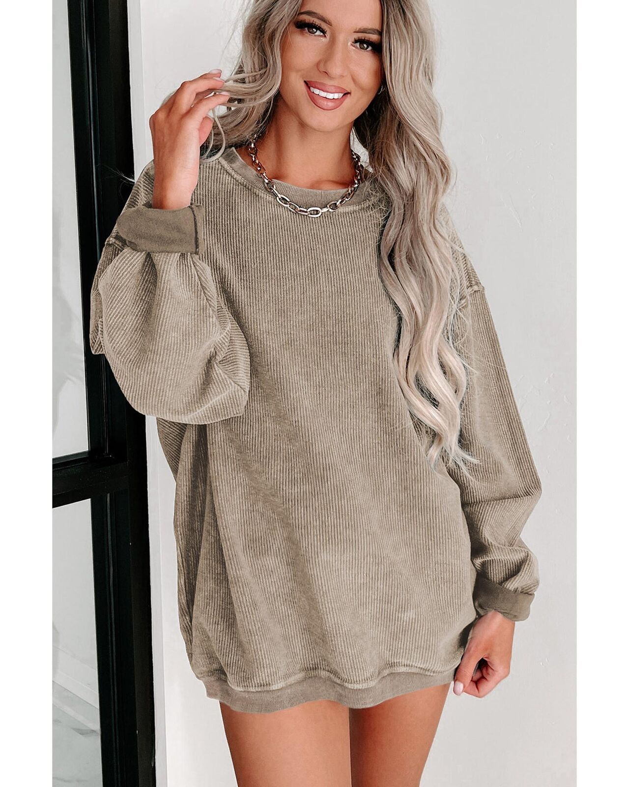 • Our styles are designed with a trendy fitted look in mind following an international size standard. For the best fit we suggest choosing one size up from your usual. Be sure to check our sizing chart to find your perfect match! Khaki solid ribbed knit round neck pullover sweatshirt Relaxed fit with long sleeves Ribbed knitting design adds texture Versatile style pairs effortlessly with jeans denim shorts or pants Available in various sizes High elasticity for a comfortable fit Chic and stylish addition to your wardrobe