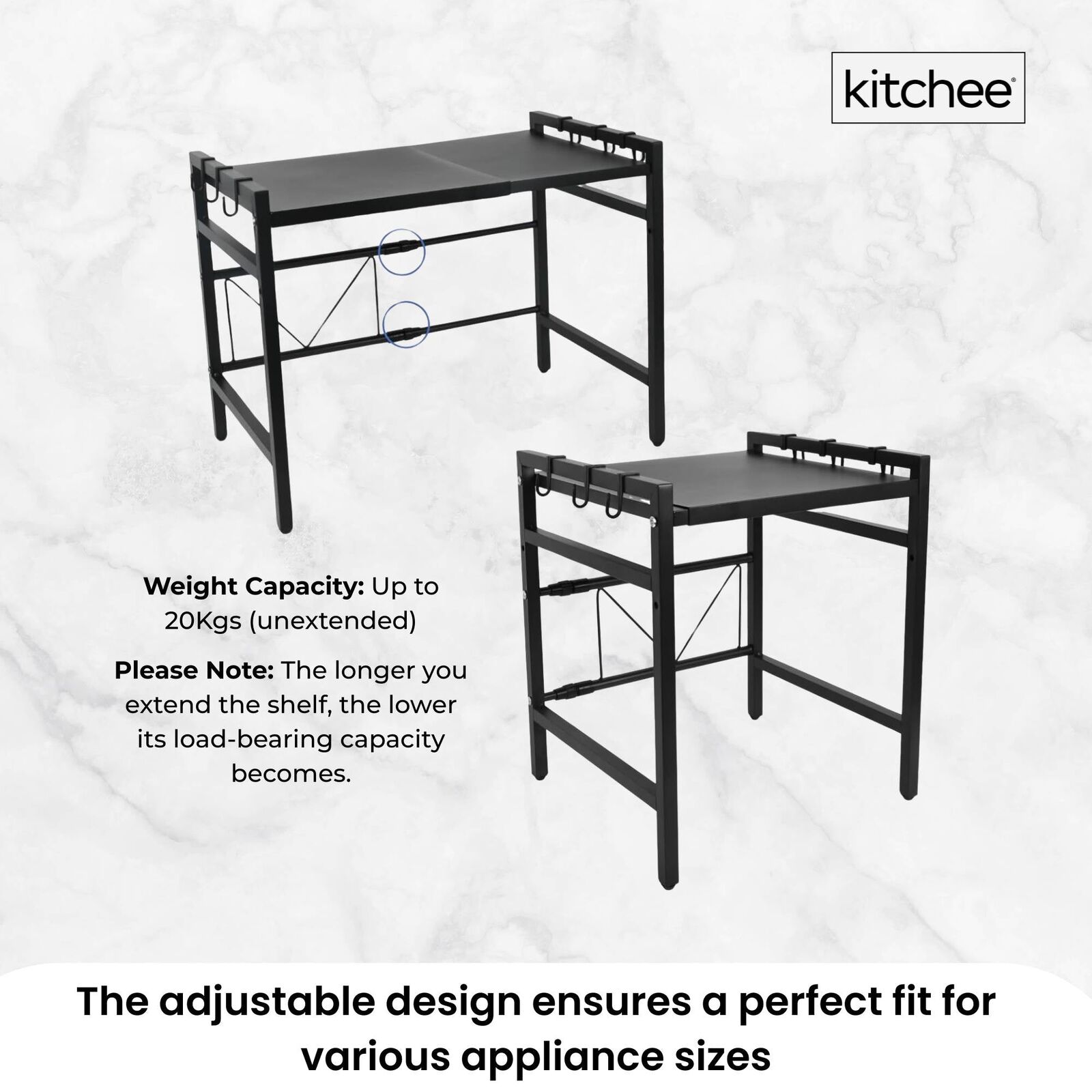 - Adjustable Design: Customise the shelf length (40 - 60 cm) to accommodate different appliance sizes.