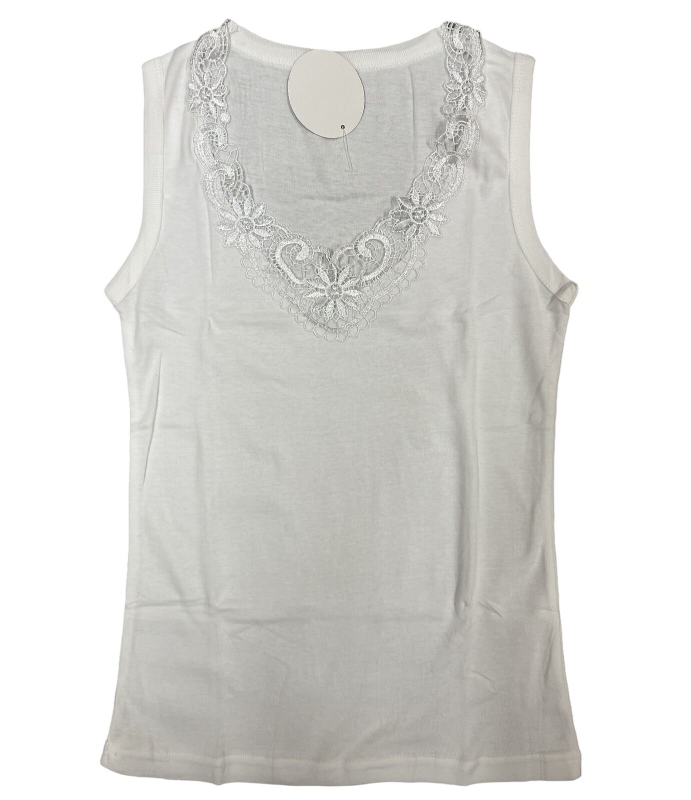 Ladies Sleeveless Singlet Top Womens Summer Basic Tank Shirt Lace Motif Front - Natural - 12-14