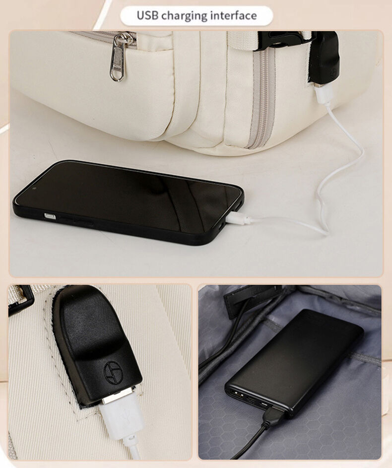 This stylish and functional large-capacity backpack is designed to make your travels hassle-free. With a lightweight design, dedicated compartments, and a built-in USB charging port, it is ideal for both daily use and extended trips. The beige color adds a touch of elegance while ensuring practicality.